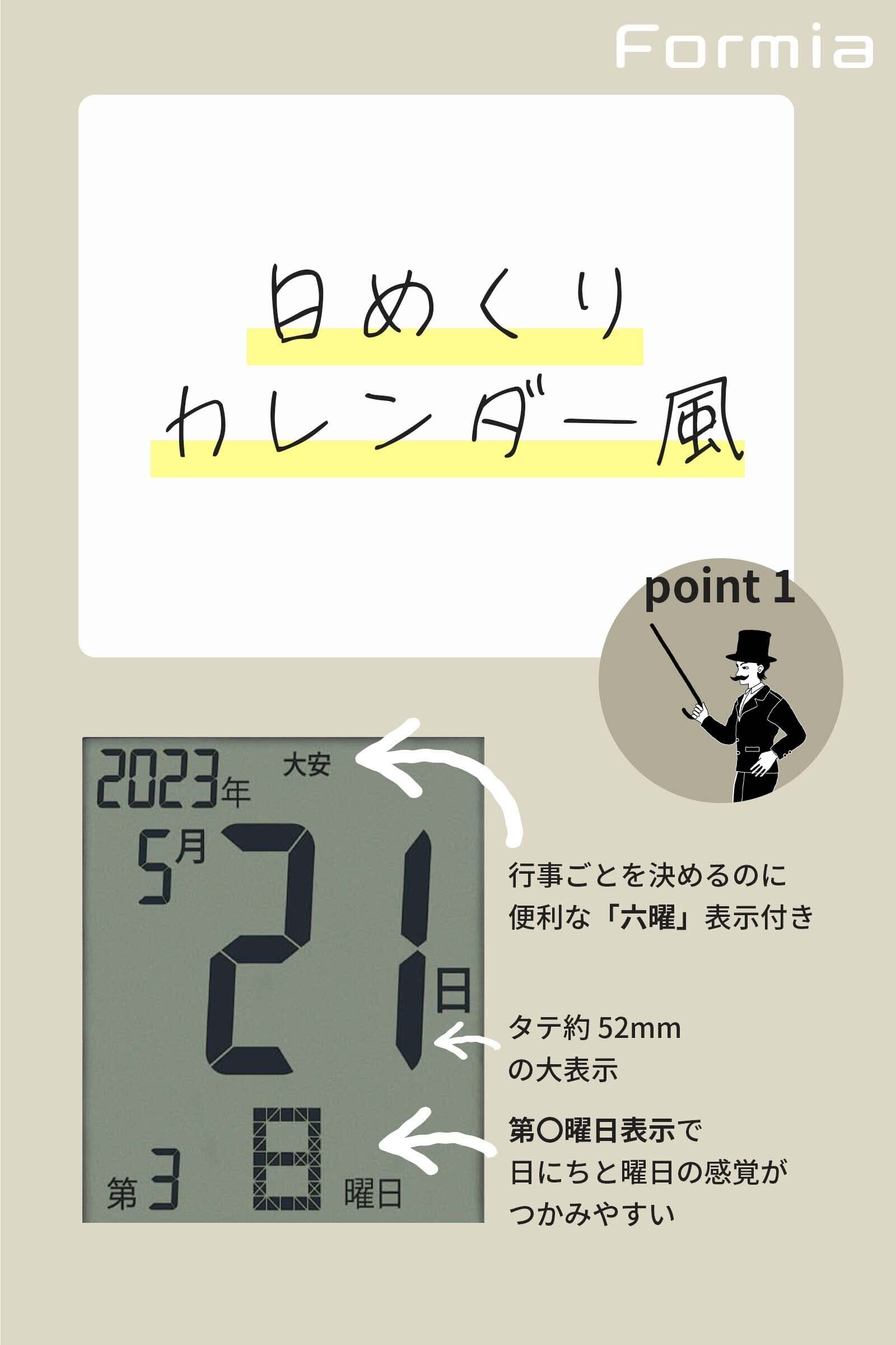 機能:電波受信機能 (自動受信/手動受信)、電子音アラーム、スヌーズ機能、六曜表示、温度表示、湿度表示、カレンダー表示、12/24時間制表示切替、表示切替機能 (日にちと時刻の表示位置が切り替わります)、置き掛け兼用