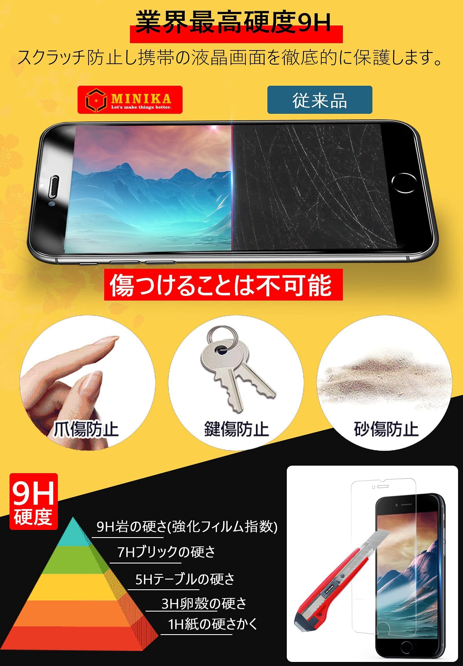 【高硬度、保護力3倍Up】 MINIKAのいphoneSE2 液晶保護フィルム 一般的な製品に比べ3倍以上の保護力があり、画面の破損を最低限まで抑え、衝撃を受けても割れにくい。優れた耐スクラッチ性能:高硬度のフィルムが日常的なスクラッチから守り、傷を付きにくくします。