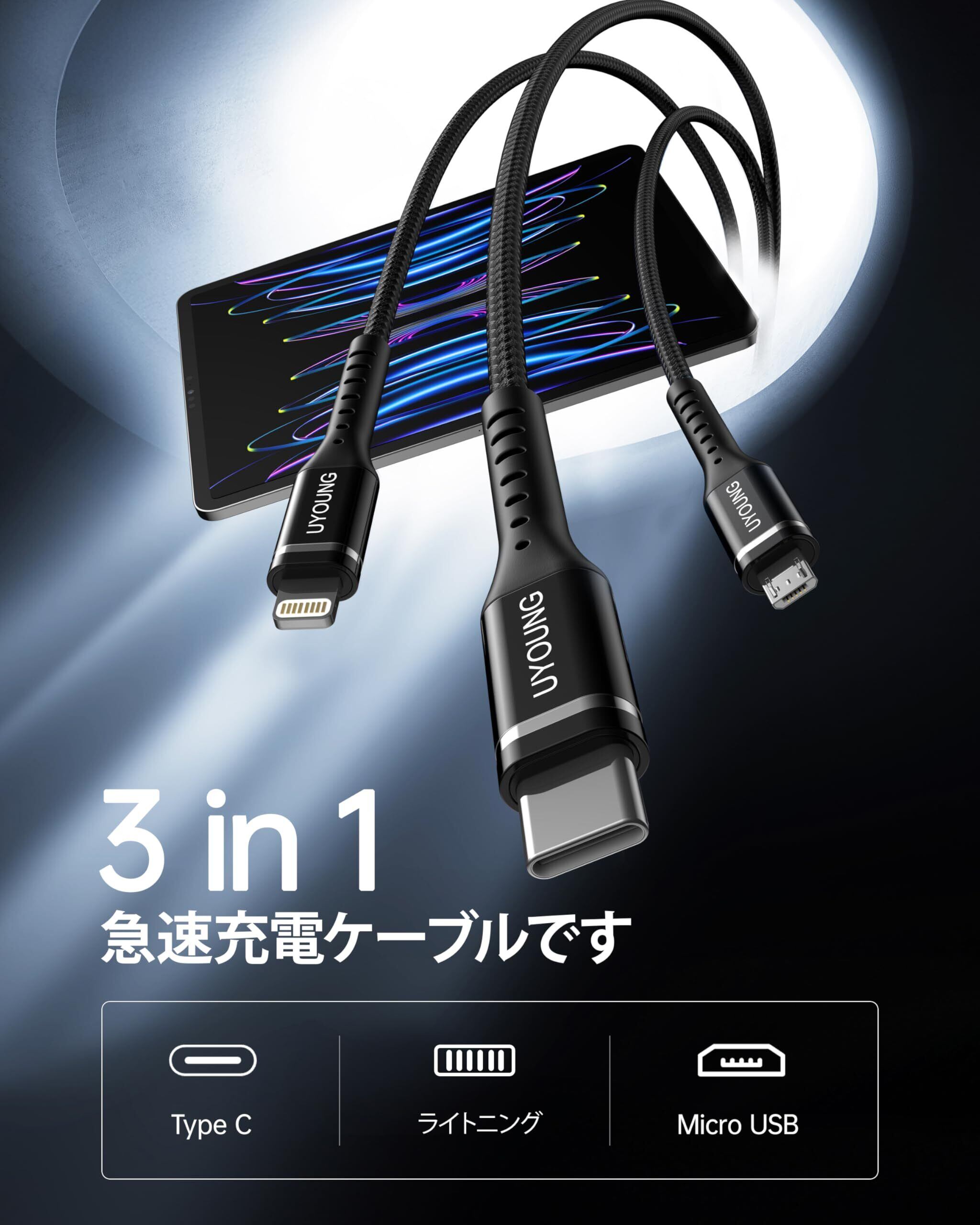 3in1 充電ケーブル USBケーブル 3 in 1 充電コード 1.2m (ライトニング/USB-C/Micro USB端子) iPhone Android タイプC ケーブル 各種対応 | yankees