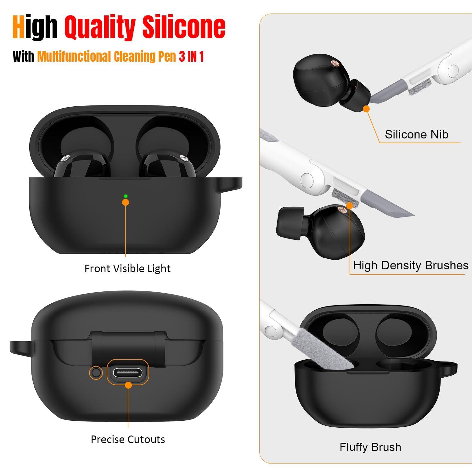R-fun ケース Sony WF-1000XM5(2023) 対応、Sony WF-1000XM5 対応シリコンケース、ワイヤレス充電対応、キーチェーンとクリーニングキット付き、ブラック