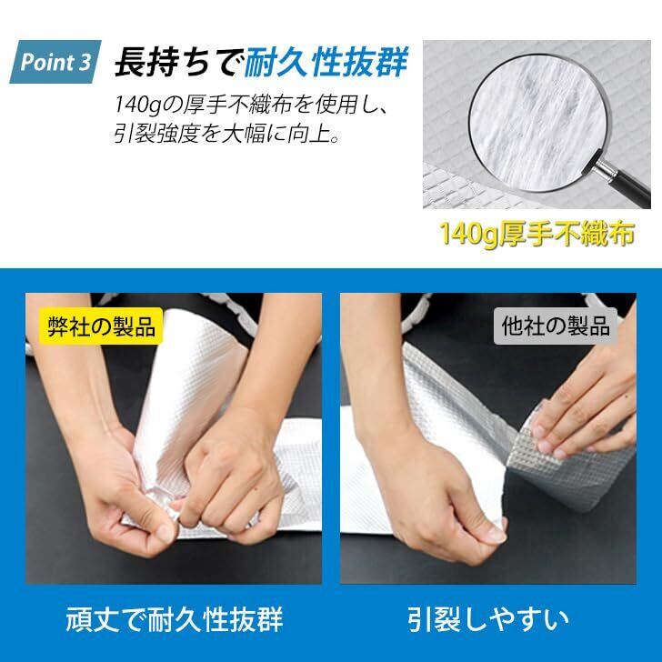4.【全新アップグレード】市場の一般的なブチルテープより0.5mm厚い1.5mmで、耐久性と耐摩耗性が向上。厚みのあるアルミ膜で高い反射率を実現し、耐熱性を強化。140gの厚手不織布を使用し、引裂強度を大幅に向上。高品質アルミブチルテープは、長寿命で信頼性の高い防水ソリューションです。