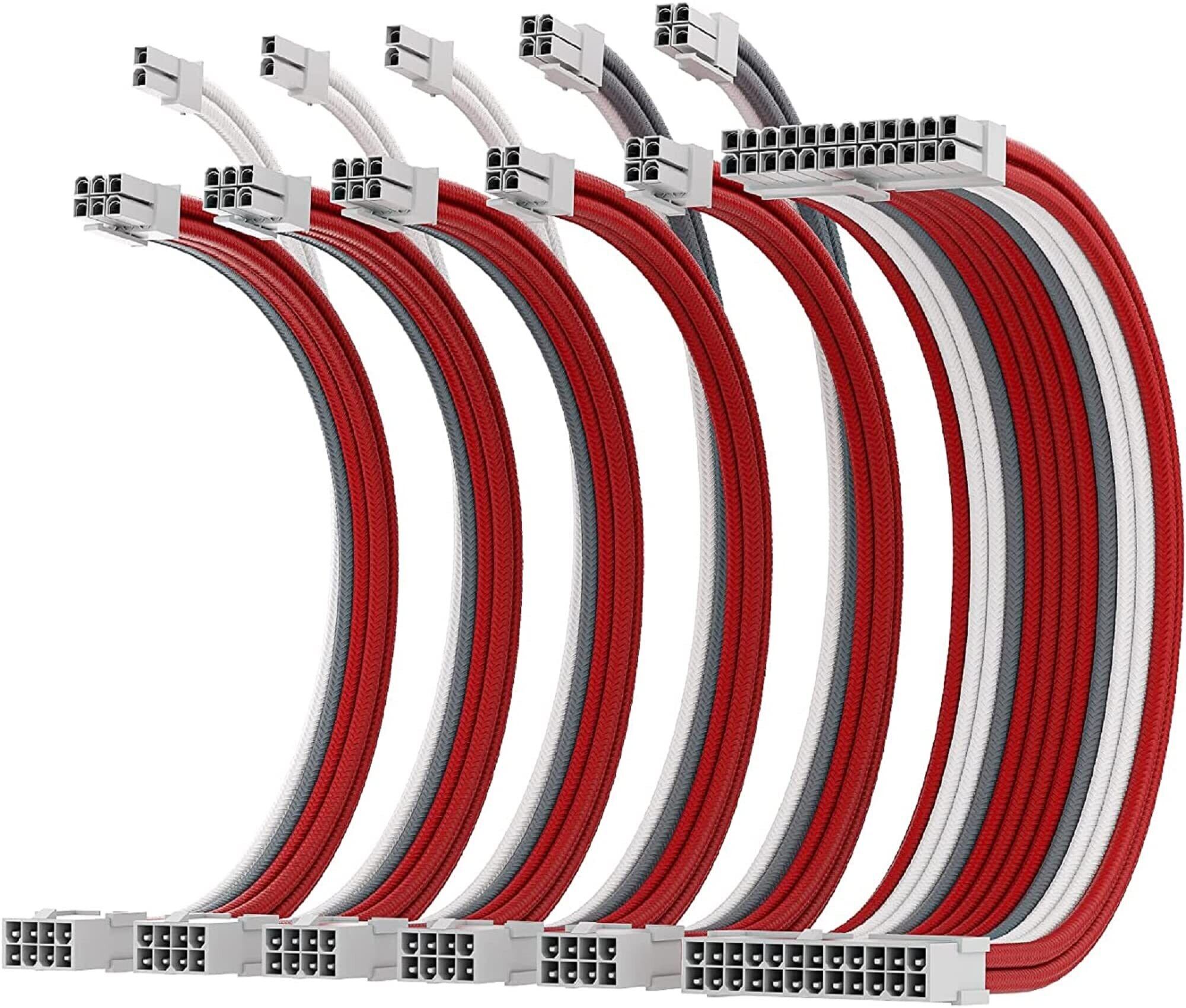 AsiaHorse 更新 16AWG PC電源 延長ケーブル、GPU/CPU 用 PC スリーブケーブル キット、電源コンピュータ ケーブル延長ケーブル コーム付き、24PIN/(6+2) PIN/(4+4)PIN ケーブル管理、30CM、白雪姫+赤+灰