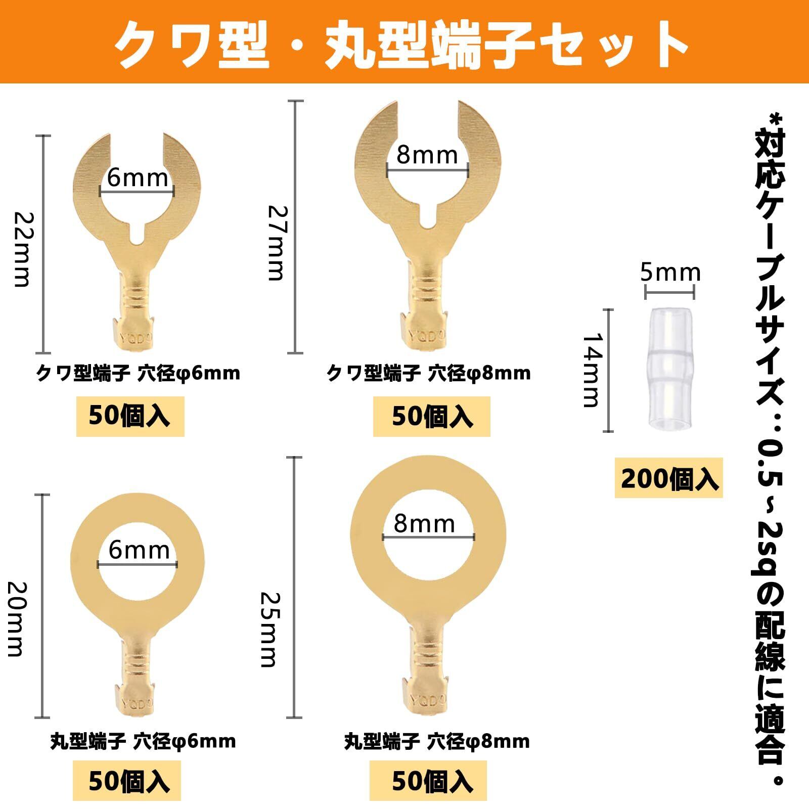 クワ型 丸型 端子セット 6mm 8mm 真鍮 圧着端子 400個入 絶縁スリーブ付き アース取り ケーブル 配線接続 端子 ターミナル コネクター 自動車 バイク スピーカー 0.5~2sq