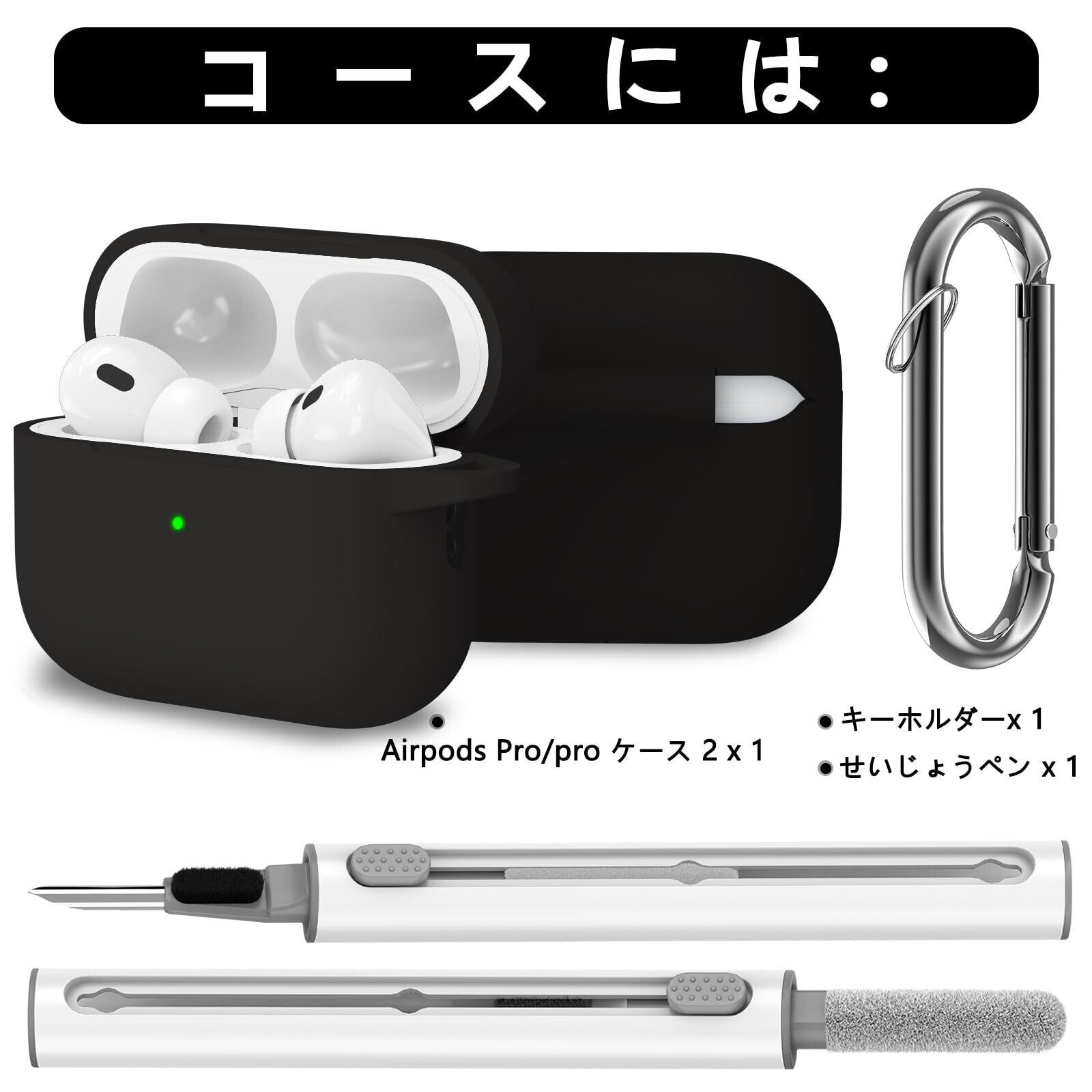 Inesore for AirPods Pro ケース(2023/2022/2019)エアーポッズ プロ 2 ソフトシリコン 保護 ケース カラビナ付き、せいじょうペン装備 全面保護、強力な落下防止、耐衝撃、男性と女性 AirPod pro 2 /1 Gen(USB-C/Lightning Cable) 共用ケース(ブラック)