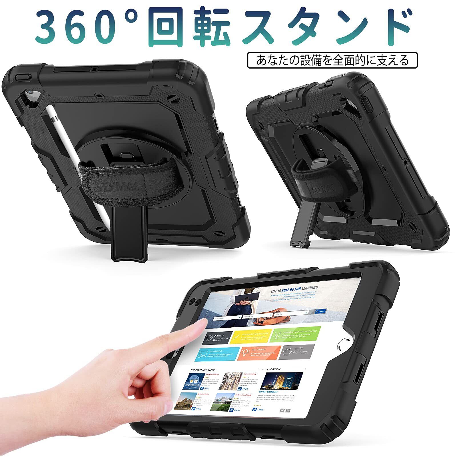 SEYMAC stock iPad Mini5/Mini4 ケース 耐衝撃 保護フィルム付き ペン収納 360°回転スタンド ハンドストラップ ショルダーストラップ 全面保護カバー (ブラック) | yankees