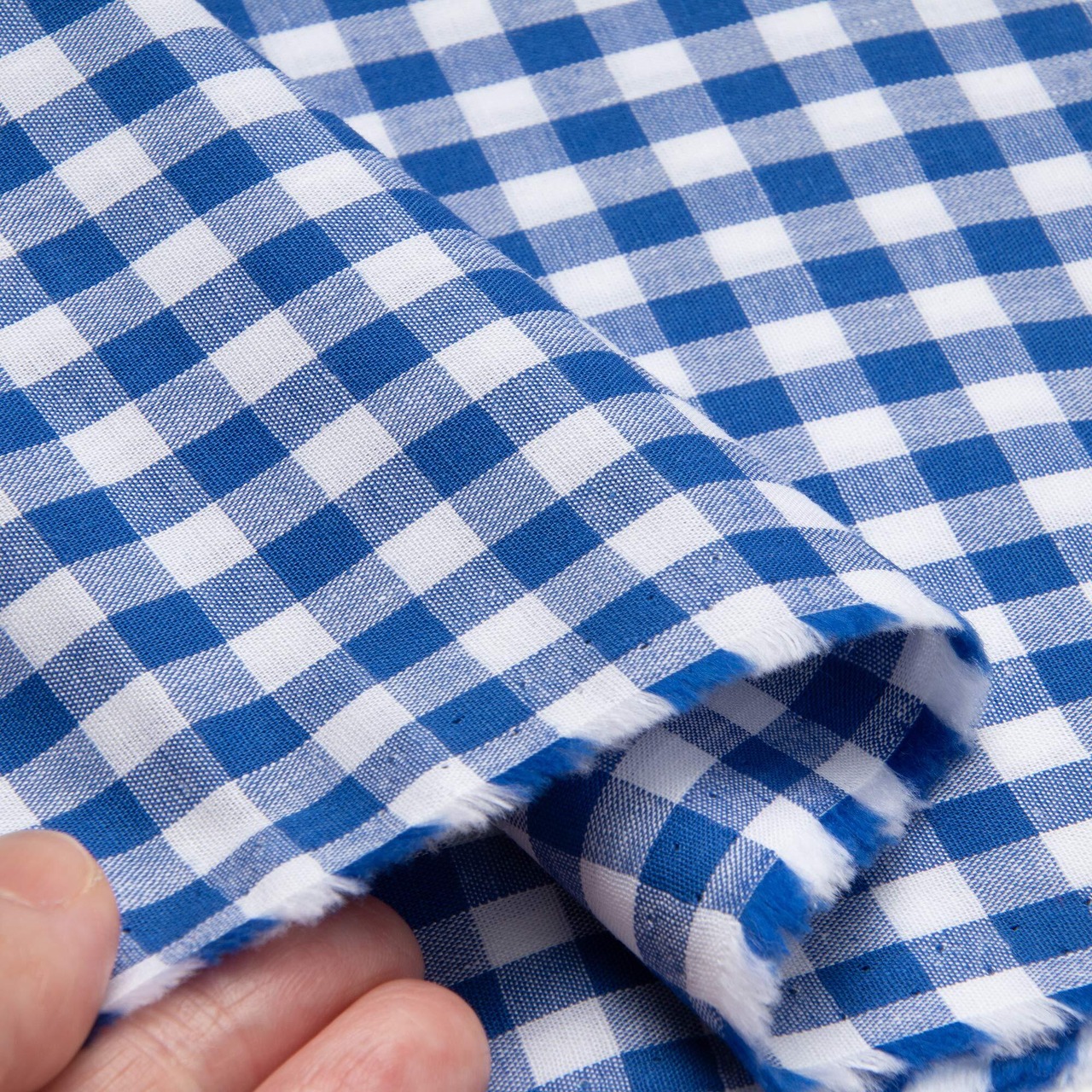 様々なシーンに使いやすい6mm角のギンガムチェックのシャンブレー生地。40番手の糸で織られた少し薄手でさらりとした肌触りの生地です。