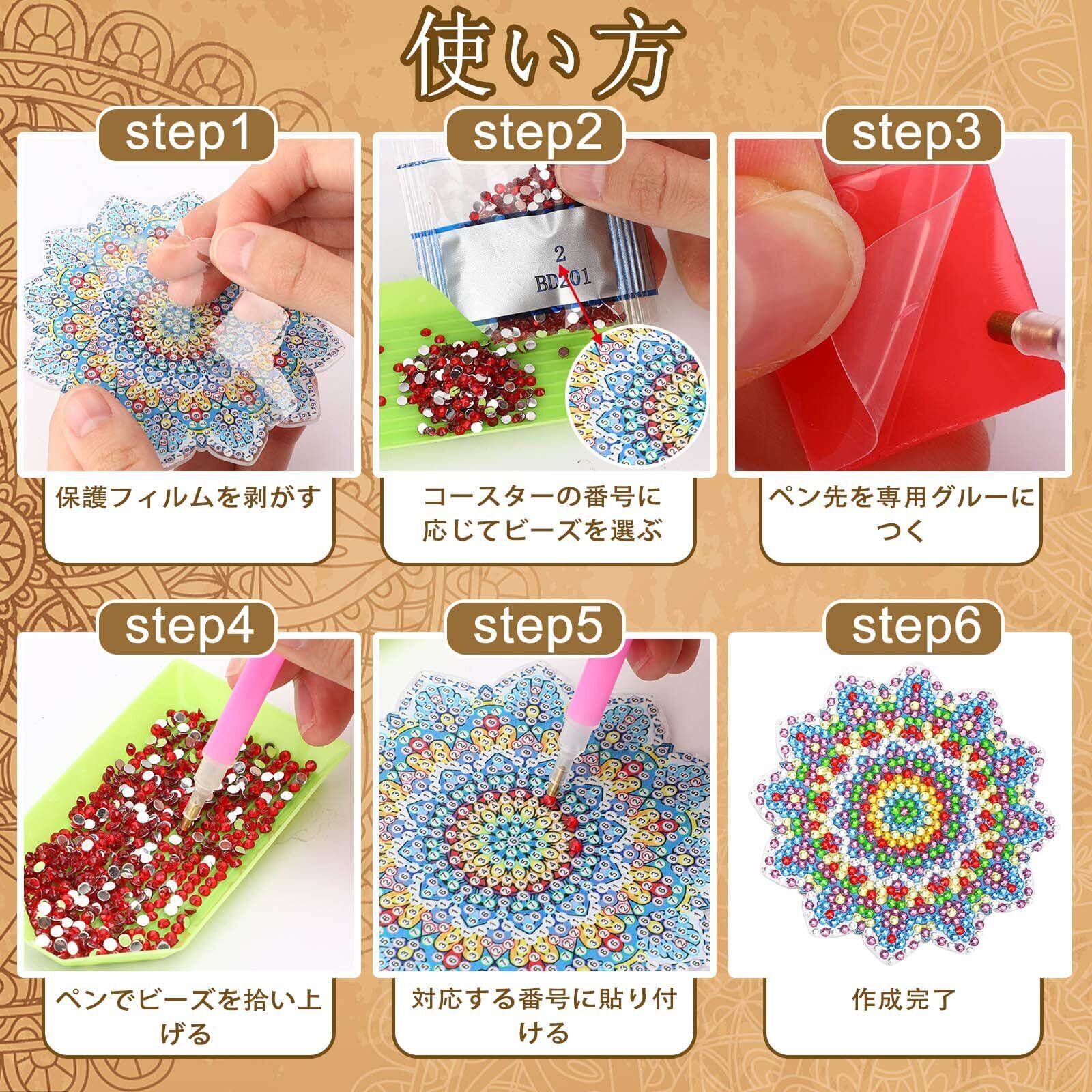【使いやすい】ダイヤモンドアート セットは粘着タイプで、作り方も簡単です。まず、コースターの上面にカバーしている保護フィルムをはがします。次に、番号に従ってダイヤモンドビーズを選択し、赤い接着剤のついたペンでビーズを拾い、対応する番号の位置に貼り付ければ完了です。