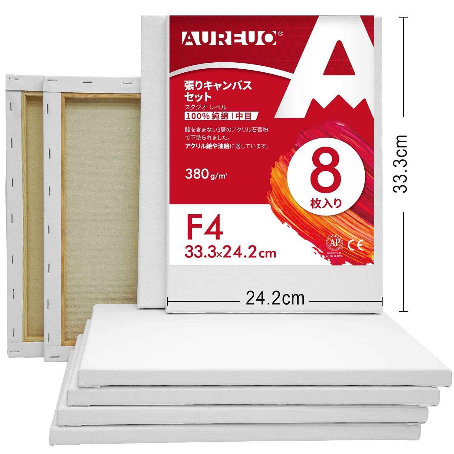 AUREUO 張りキャンバス セット F4 (33.3cmX24.2cm) 中目 100%コットン 8枚 初心者 絵画用具 芸術絵創作 現代油絵 美術装飾 水彩画・油絵画・アクリル兼用