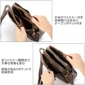メイン収納のほかに前後にあおりポケットがあるのでバッグの中がキレイに収納できるのもポイント。お財布・スマホ・コスメポーチ・ハンカチなどお出かけに必要な最低限の持ち物がしっかり入るので女子には嬉しいサイズです◎ 長財布が入るサイズ感も嬉しいポイント。