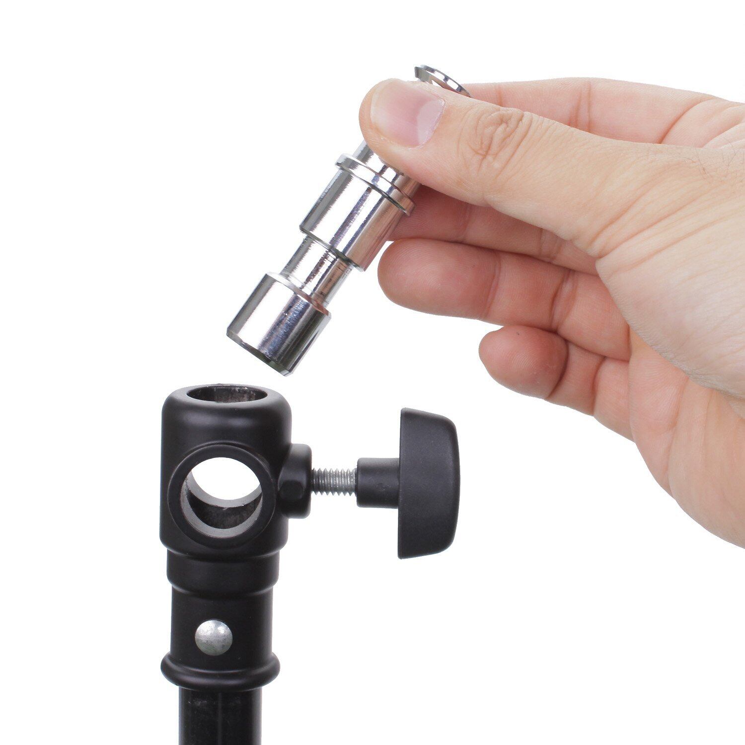 主に国内メーカー製のライトスタンド等の先端部に設けられているφ17mmメスダボを、海外製のライトスタンド等に用いられるφ16mmオスダボに変換するアダプターです。16mmオス側は真円ではなく、固定部の空回りを防止できるよう、一部平面の削りがなされていて、安定性に優れています。