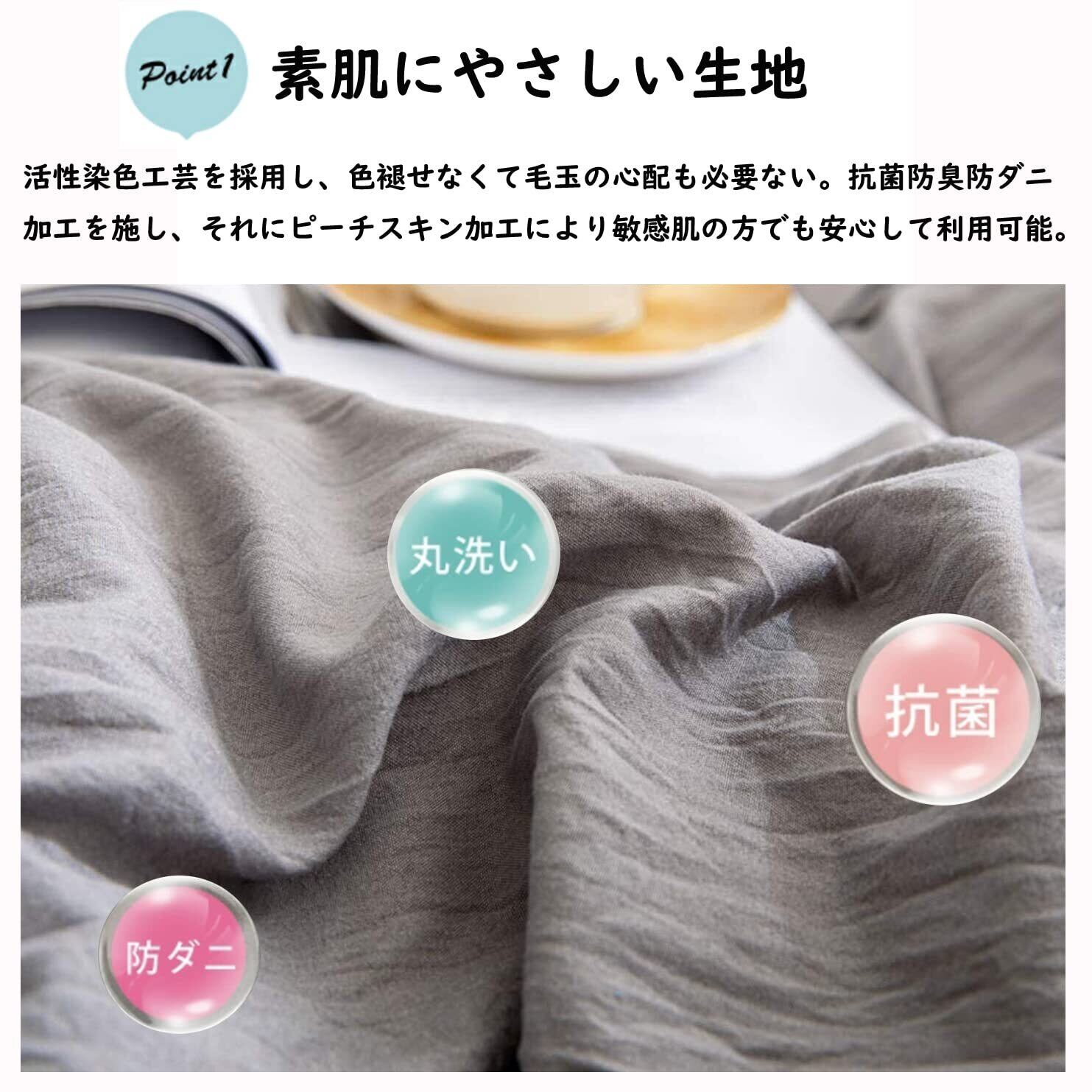 【素肌にやさしい生地】:活性染色工芸を採用し、色褪せなくて毛玉の心配も必要ない。毎日、素肌に触れるものだからこそ、抗菌、防臭、防ダニ加工を施しています。ピーチスキン加工により敏感肌の方でも安心して利用できます。