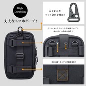 ◆撥水強化ポリエステル生地を使用し、破れやすい箇所は補強テープなどで強化している丈夫なスマホポーチです。