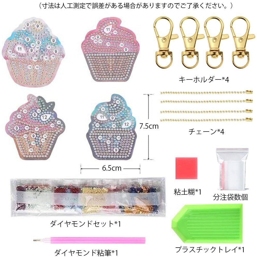 セット内容:ダイヤモンドキーホルダーセット4セット、PVC基板*4+チェーン*4+キーホルダー*4+ダイヤモンド材料パック*1+ツールパック*1(ダイヤモンド粘筆*1+プラスチックパレット*1+粘土糊*1+若干分装袋)サイズ:約6.5 cm×7.5cm。