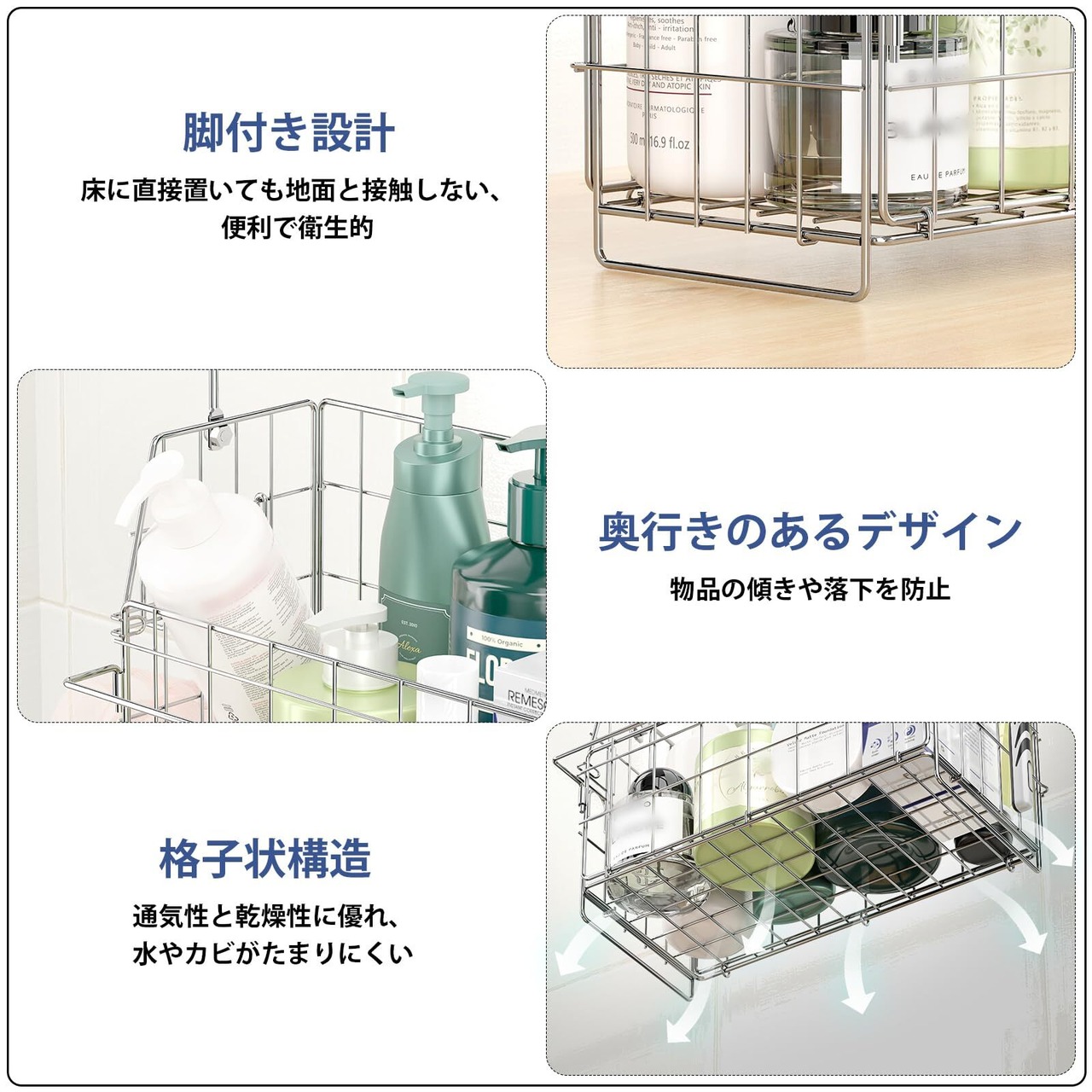 【幅広い用途】このステンレス バスケットは、吊り下げ棒があるあらゆる場所に適しています。脚が付いているので、床に置いても使用可能。床に置いたときに底が直接床に触れない形なので、汚れがたまりにくい。 洗面所にフックをかけるスペースがなくても、床に直接置いて使うことができます。バスルームだけでなく、ランドリールームで洗剤や柔軟剤、洗濯ネットなどをすっきり収納できるランドリーバスケットとしても便利に使えます。また、ベランダに置いて、掃除用具や洗濯ばさみなどを収納することもできます。ご家庭のさまざまな場所に適しています。日常使いにとても便利です。注:ご購入前にバーの長さが30cm以上であることをご確認ください。