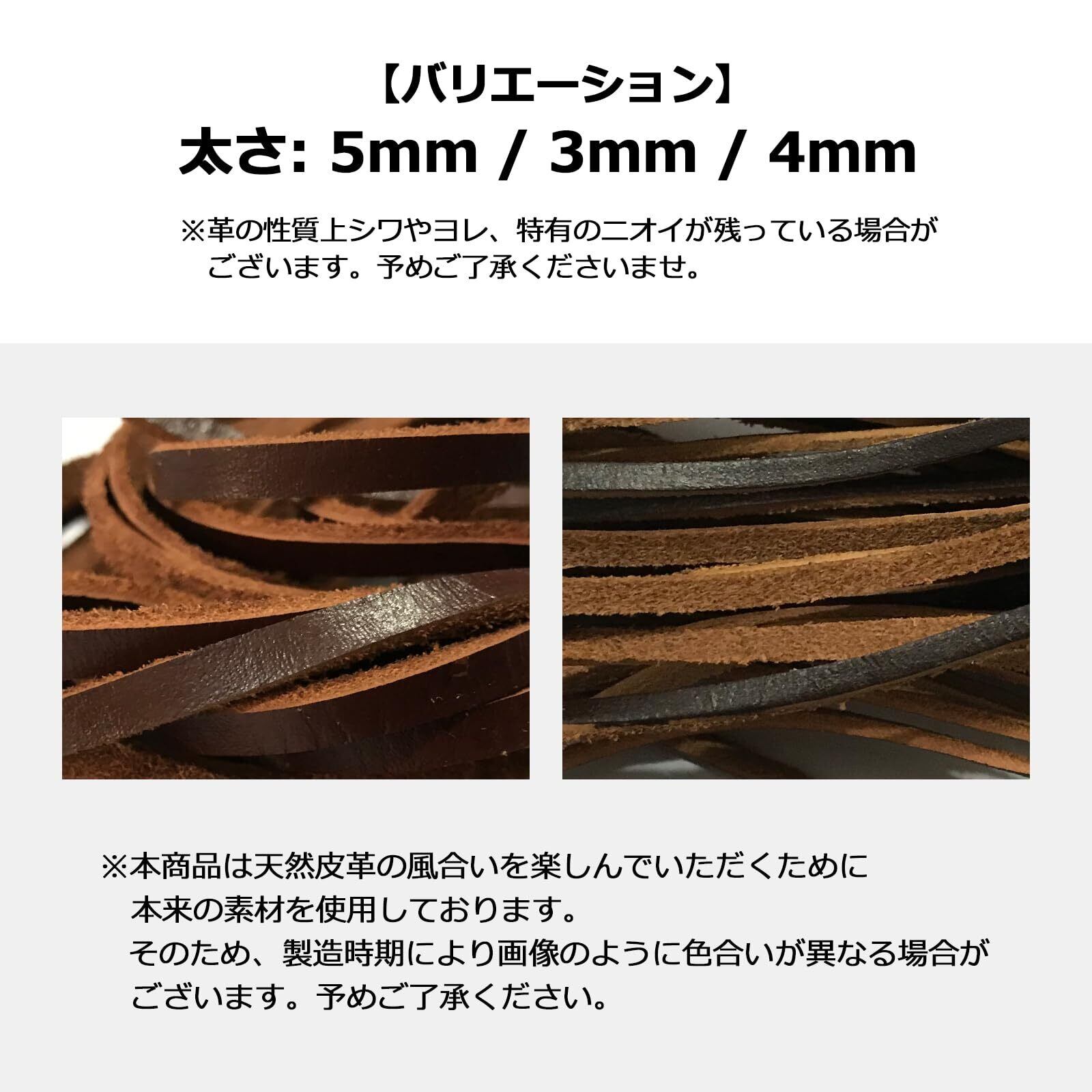 上品なダークブラウン色の革紐は、幅3mm、4mm、5mmの3種類から選べる平紐タイプ。牛革素材を使用しており、ストラップやキーホルダー、レザークラフト作品など、さまざまな手芸用途に最適です。厚さは2mmでハサミでも簡単にカットでき、ひび割れしにくい柔軟性を備えています。