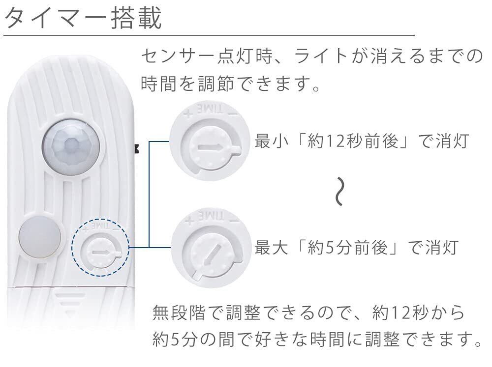 タイマー設定があり、センサー点灯時、ライトは消えるまでの時間を約12秒から約5分の間で調節できます。