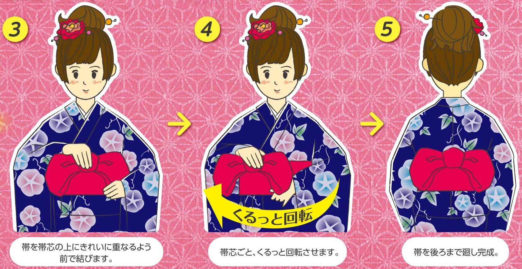 帯を前で結び、くるっと帯板ごと後ろに廻すと出来上がります。後ろ手で結ぶより簡単に帯結びができます。着物、浴衣どちらでも使用出来ます。