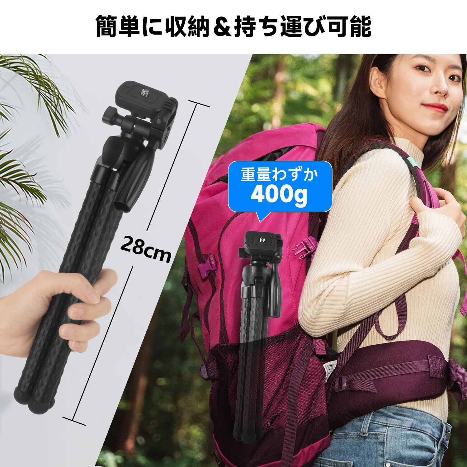 【携帯便利】くねくねスマホ三脚は軽量コンパクトで、持ち運びに楽です。パッケージ内容:卓上三脚x1、スマホホルダーx1、Bluetoothリモコンx1、日本語取り扱い説明書x1。パッケージ重量約0.4kg