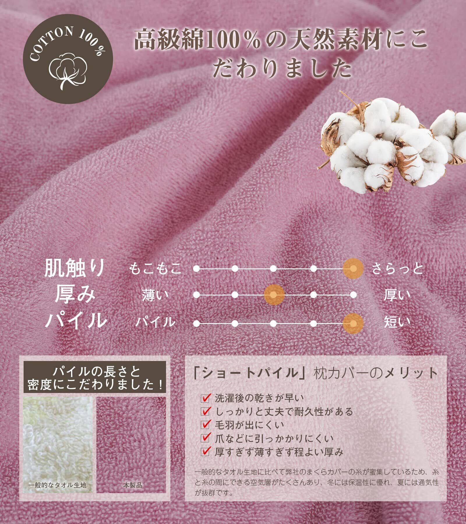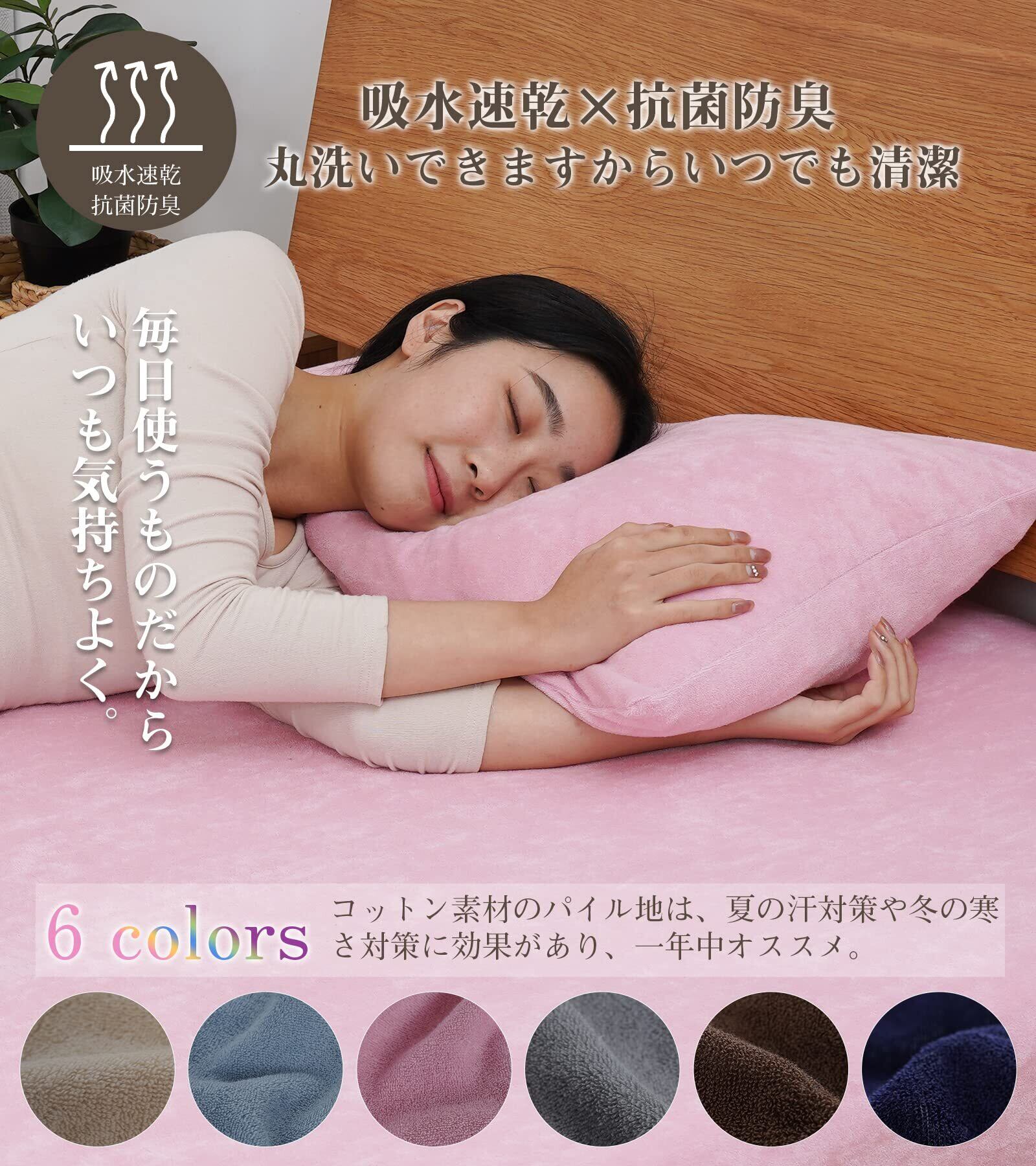 【抗菌防臭・オールシーズン使える】抗菌防臭加工で細菌の増殖を抑制し、防臭効果を発揮します。吸水性が高い枕カバーは寝汗素早く吸収し、サラサラカバーです。コットン素材のパイル地は、夏の汗対策や冬の寒さ対策に効果があり、一年中オススメ。