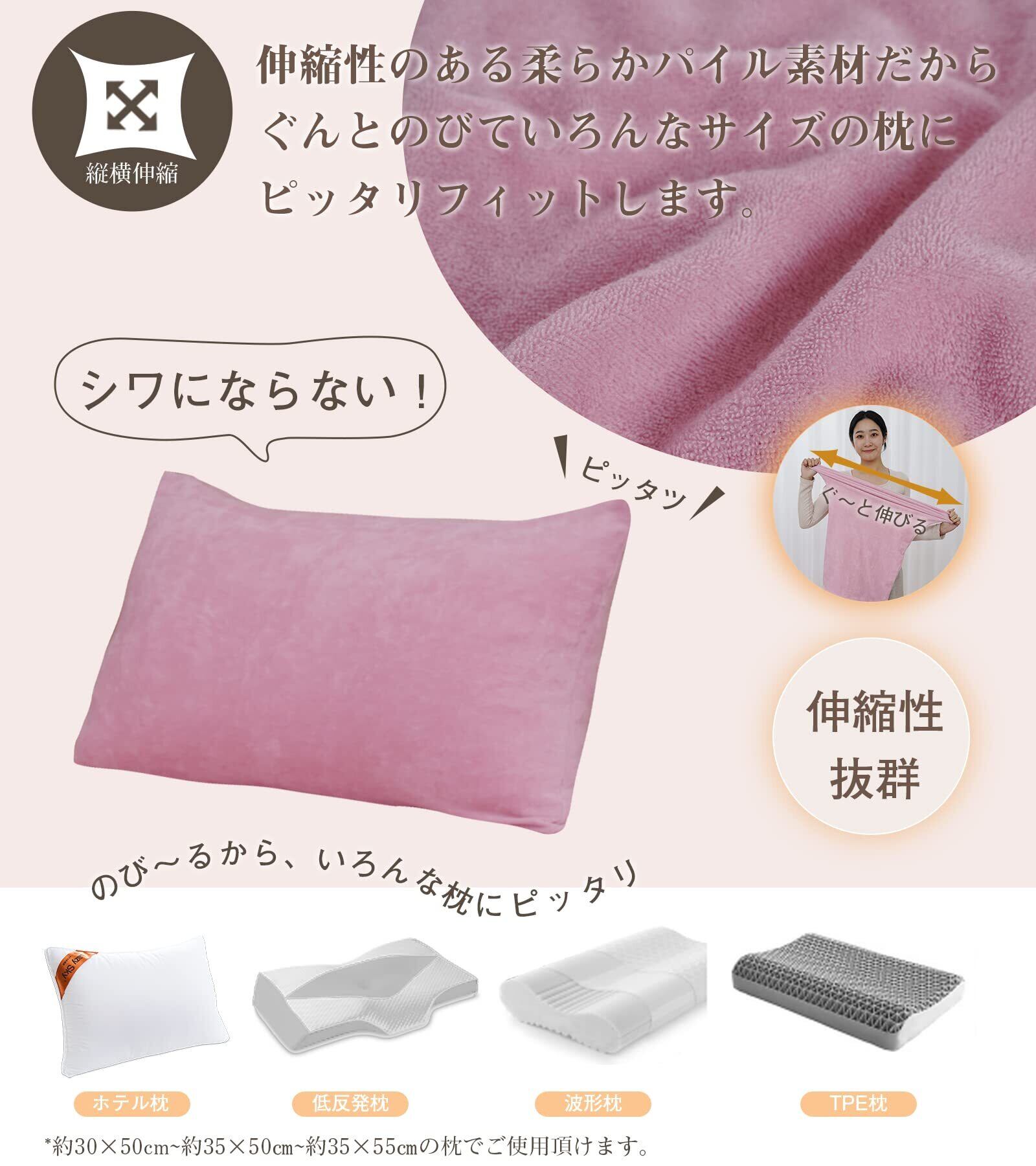 【のびのび素材であらゆる枕にフィット】:枕カバーの本体サイズ:約32×約48㎝。タテ・ヨコ自在にぐんぐん伸び、お使いのまくら(低反発枕、カーブ形状の枕、変形した形の枕など)をしっかりカバー。約30×50cm~約35×50㎝~約35×55㎝の枕にも対応できます。まくらカバーの素材:パイル部分:綿100%、グランド部分:ポリエステル95% ポリウレタン5%。
