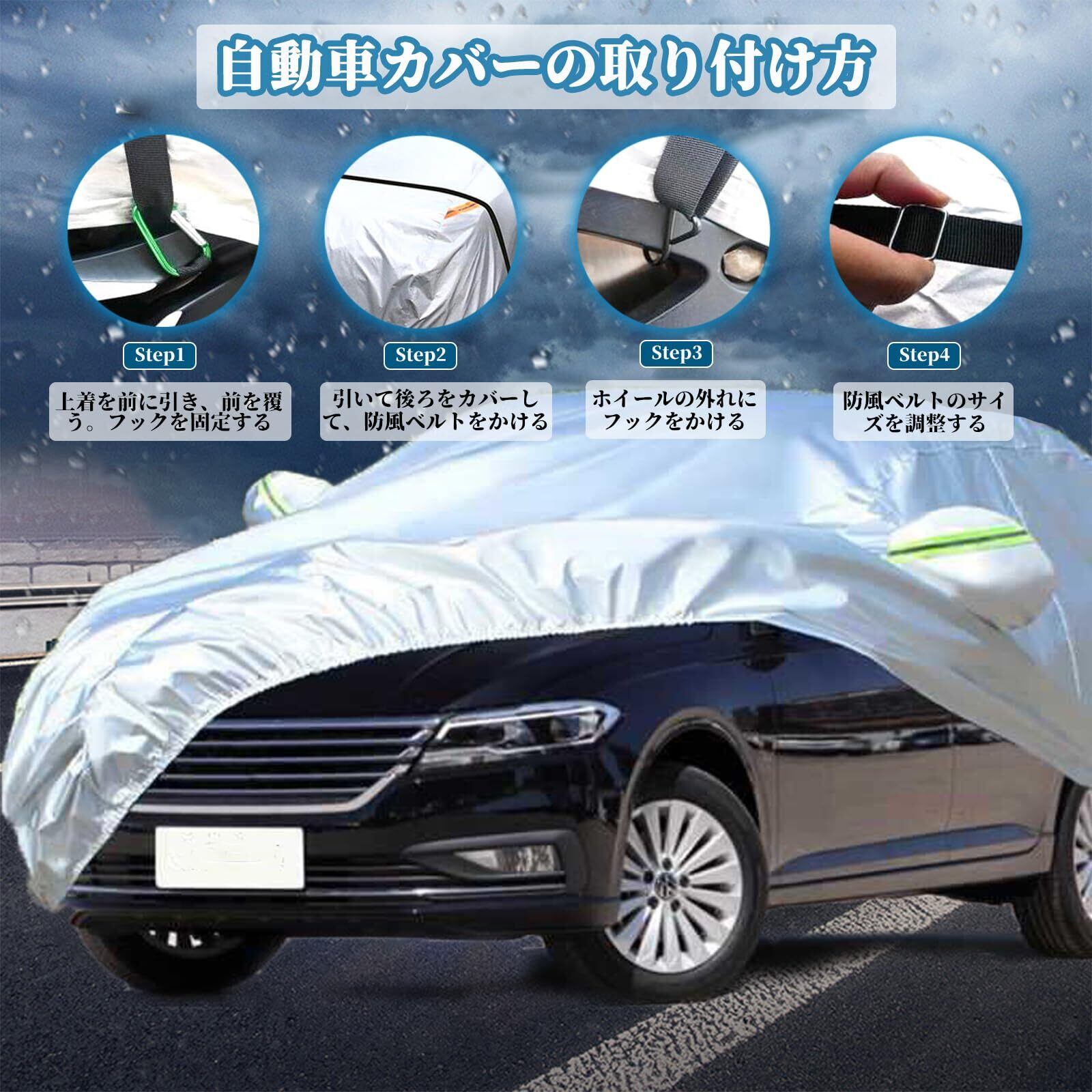 【良い防水性と反射帯デザイン】:高密度のガタフ生地を採用しており、外層に銀を塗り、しっかりと防水効果を発揮しています。長時間激しい雨水に晒される台風や豪雨などの場合に対応できます(※完全防水ではない)。また、蛍光反射ストリップを付き、夜の認識性が大幅に向上させて、夜間の路上駐車の安全性を向上させます。運転席側に助手席側ともファスナーがつているため、狭い駐車場でも車内へのアクセスがより便利になり、忘れ物をしても心配ご無用!