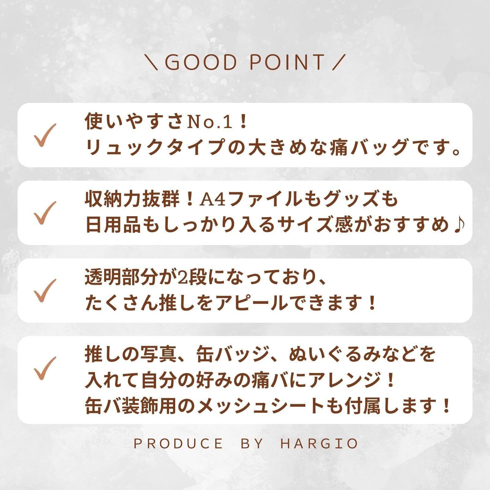 リュック型の 痛バッグ です。 推し の写真、缶バッジ、ストラップ などを入れて自分の好みの痛バにアレンジしてください 缶バッジ装飾用のメッシュシートも付属します!