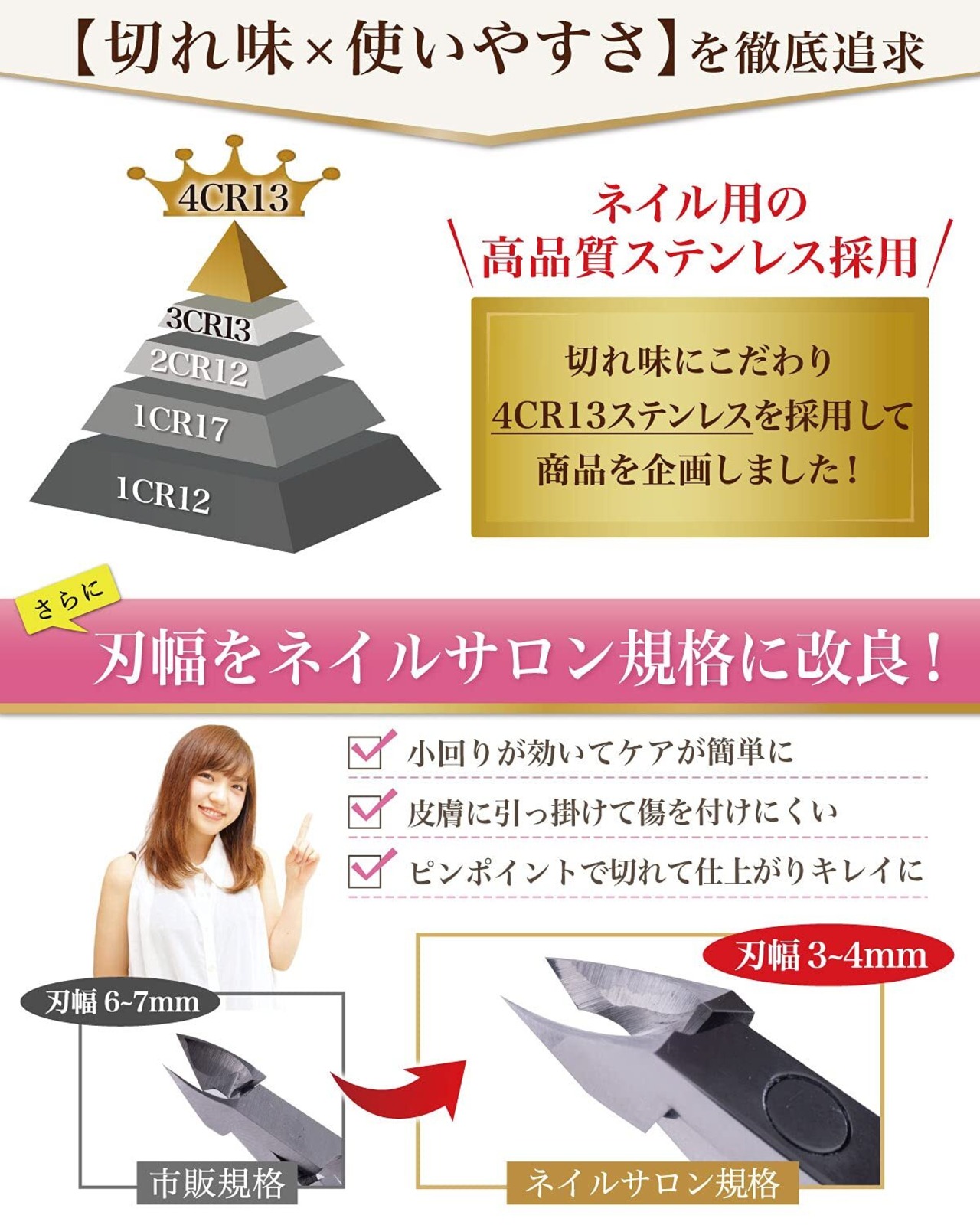 【素材も厳選】 ネイル用ニッパー の素材としてステンレスが主流となっているのですが、ステンレスの中でも5種類あります。1CR12~4CR13まで種類があり、”爪切り”では1CR12以上のステンレス、”甘皮処理”では適切とされているのは2CR12以上となっております。CRの前の数字が上がると”クロム”の配合量が増えて切れ味が上昇するため、”甘皮”の処理がサクサク進められます。