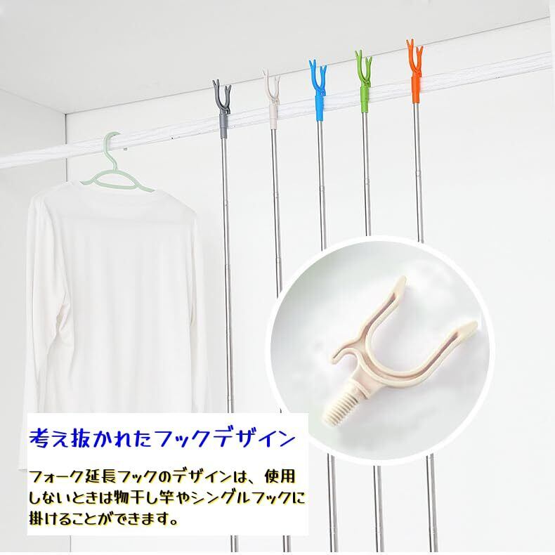 【U字型フォークヘッド設計】物干し竿のフォークヘッドの両側に小さなU字型フォークヘッドが付き、洗濯物を安定して掛けることができます。 フォークヘッドはフックデザインを拡張し、使用しないときは、物干し竿やシングルフックを掛けることができます。
