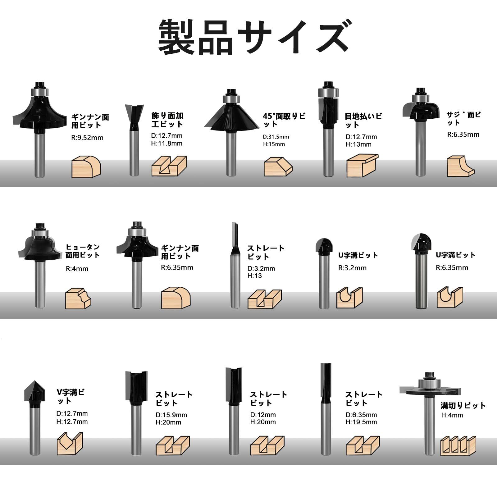 【複数タイプ】:このセットには、複数の形状を切断できる15種類のフライスビットが含まれており、1セットで様々な場面に対応できます。 プラスチックケースで簡単に収納、六角スパナを付属しています。