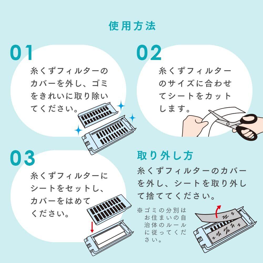 【使用方法】1.糸くずフィルターのカバーを外し、ゴミをきれいに取り除いてください。2.糸くずフィルターのサイズに合わせてシートをカットします。3.糸くずフィルターにシートをセットし、カバーをはめてください。取り外し方:糸くずフィルターのカバーを外し、シートを取り外して捨ててください。※ゴミの分別はお住まいの自治体のルールに従ってください。