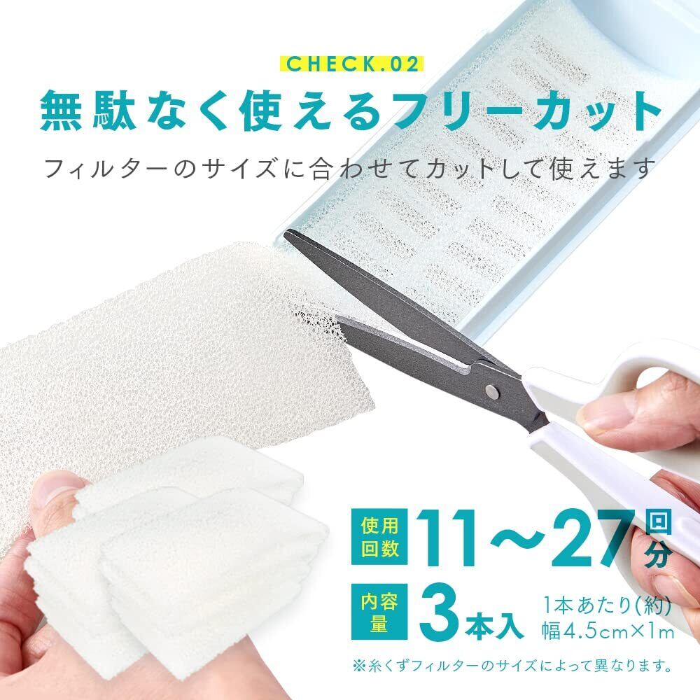 【商品仕様】内容量/3本、商品サイズ/(約)4.5cm×1m(1本あたり)、使用回数/11~27回分(※糸くずフィルターのサイズによって異なります)、材質・成分/ウレタンフォーム、ゴミ取りフィルターの横幅が4.5cm以上ある場合:糸くずフィルターのサイズに合わせて、シートを2枚カットし、セットします。