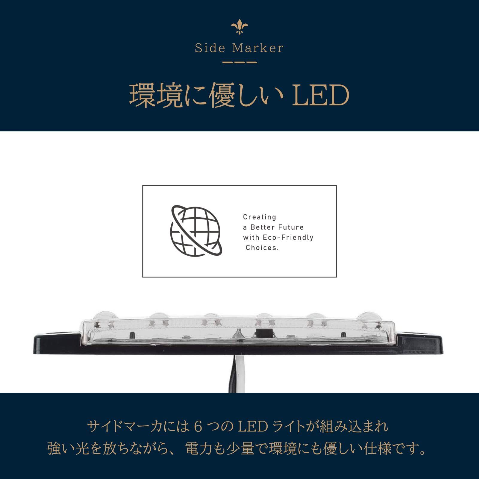 高輝度 LED採用で明るい:夜間や悪天候時には車両の横方向からの視認性が求められるため、高輝度LED採用しています。視認性が向上し、明るく発光するマーカーランプは愛車を美しくカスタム・ドレスアップすることができます。