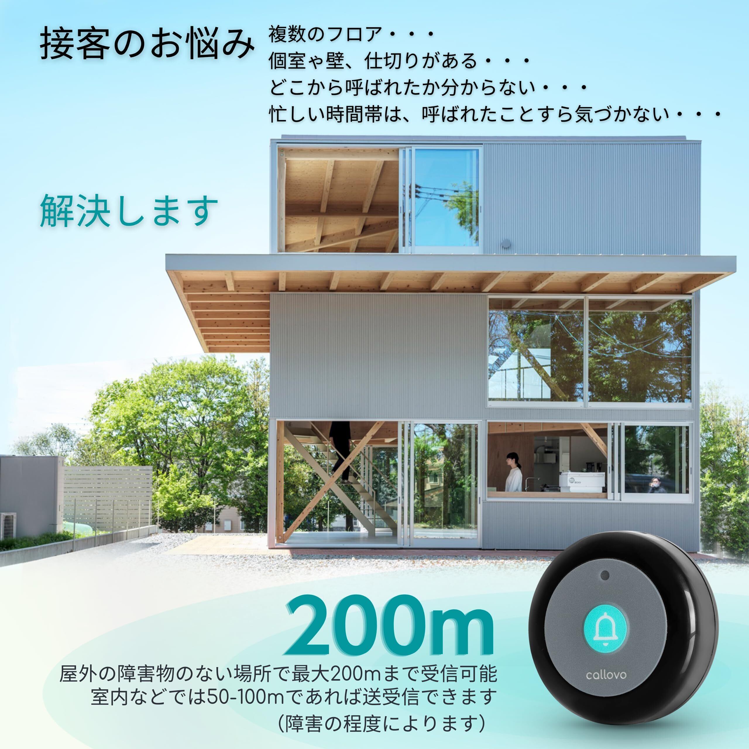 【長距離対応】:障害物がなければ最長200mで送受信可能です。屋内では50〜100mの範囲で送受信が可能です(障害物の程度による)。店舗、事務所における呼び出しや報知用に最適,工場や病院などの2〜3階建ての建物でも。