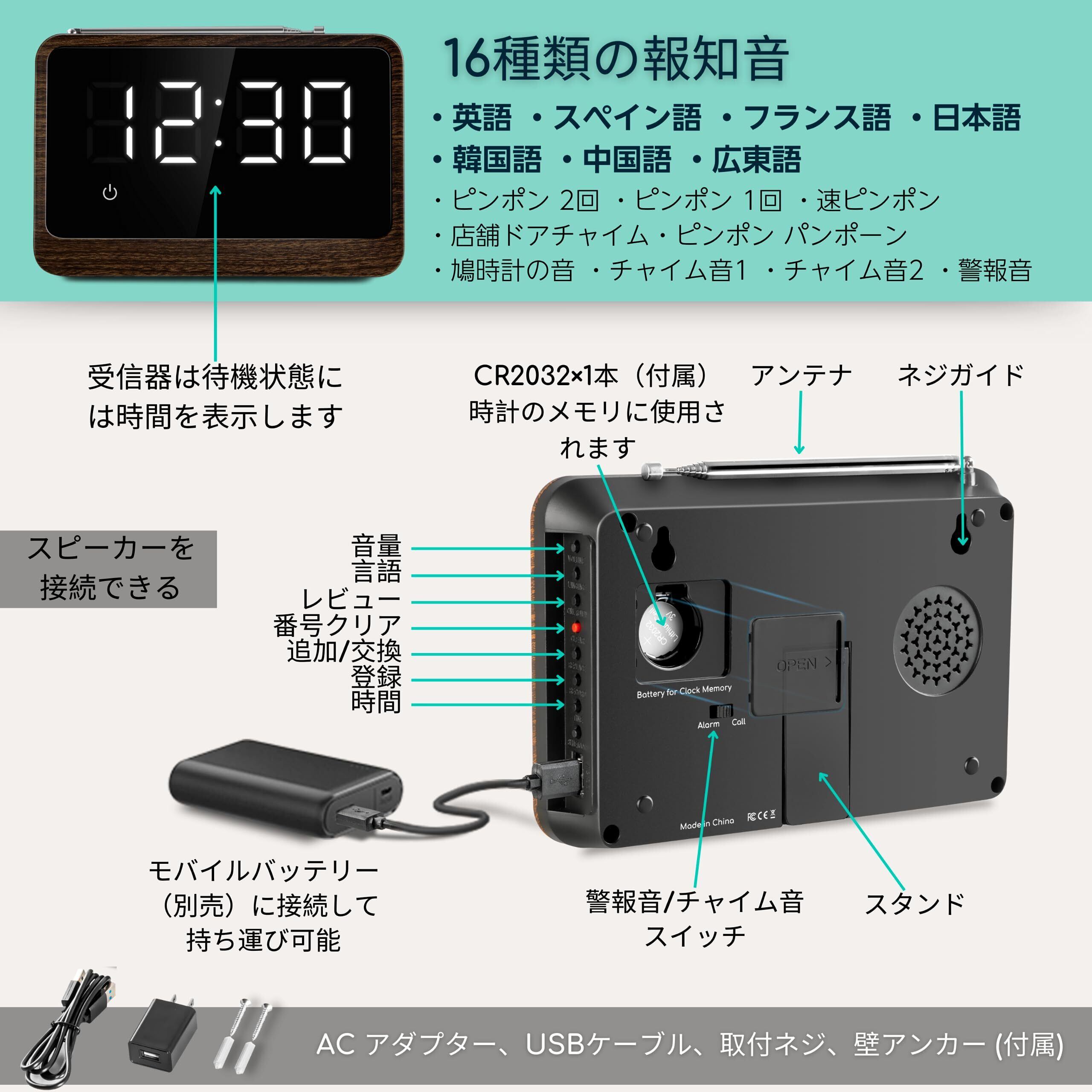 【番号表示受信チャイムで効率的な呼び出し】:押しボタン送信機を使って、遠くからでも呼び出しを受け取ることができます。チャイムは受信した番号を ✓日本語、✓英語、✓スペイン語、✓フランス語、✓韓国語、✓中国語、✓広東語のいずれかを選択して音声でお知らせします。お好みで設定できる8種類の報知音。 3段階の受信音量は調節可能。用途に合わせて送信機・受信機の増設も可能(1台の受信器に送信器を256台まで登録可能)。