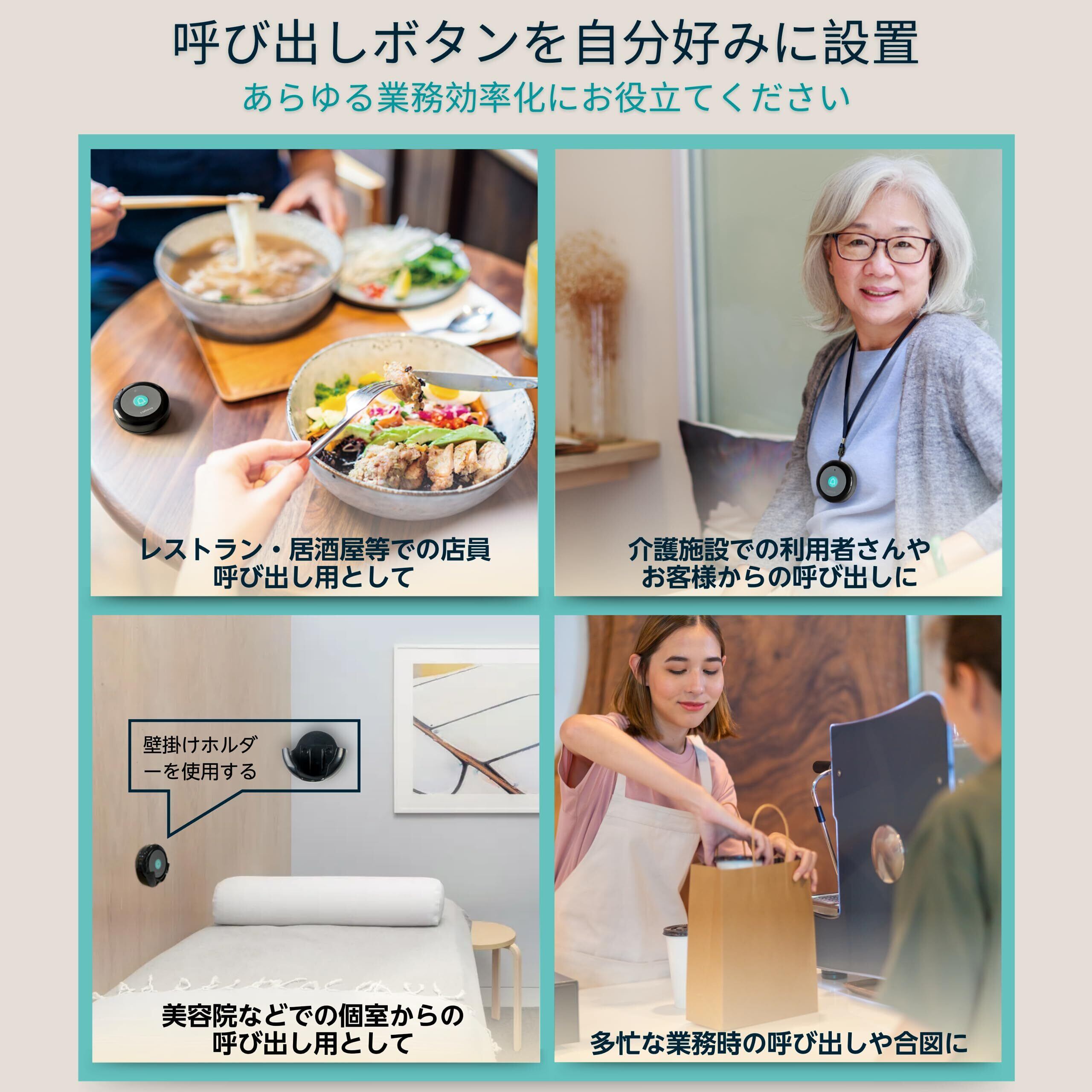 【簡単な設置と使いやすさ】: ワイヤレスチャイムはすでに10台の送信機と工場出荷時にペアリングされています。工事不要!配線不要!ボタンを押すだけで、飲食店、居酒屋、店舗、介護施設、病院など幅広い用途でスタッフが呼び出しを受けることができます。人件費の削減にもつながるコードレスチャイムです。あらゆる業務効率化にお役立てください。
