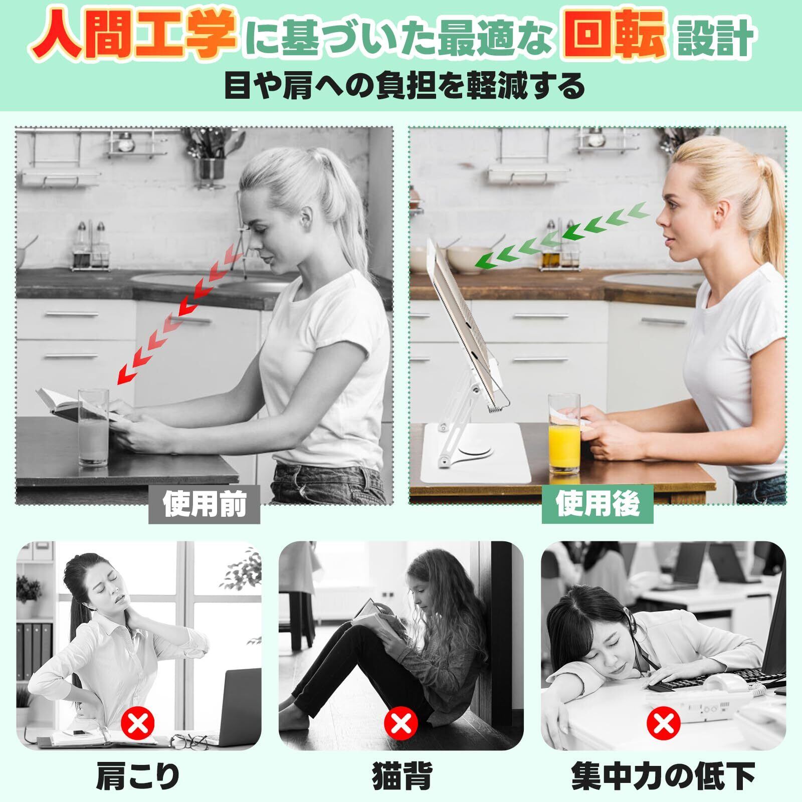 【人間工学に基づいた設計】読書スタンドは0~180度の自由調整に対応し、底部は360度回転可能なので、さまざまな読書姿勢に対応できます。本スタンドは首、肩、背中のストレスを軽減し、長時間の読書や仕事による筋肉疲労や集中力の低下を抑え、読書スピードと仕事の効率を向上させることができます。読書棚は座り方を矯正するだけでなく、目を守ることもできます。
