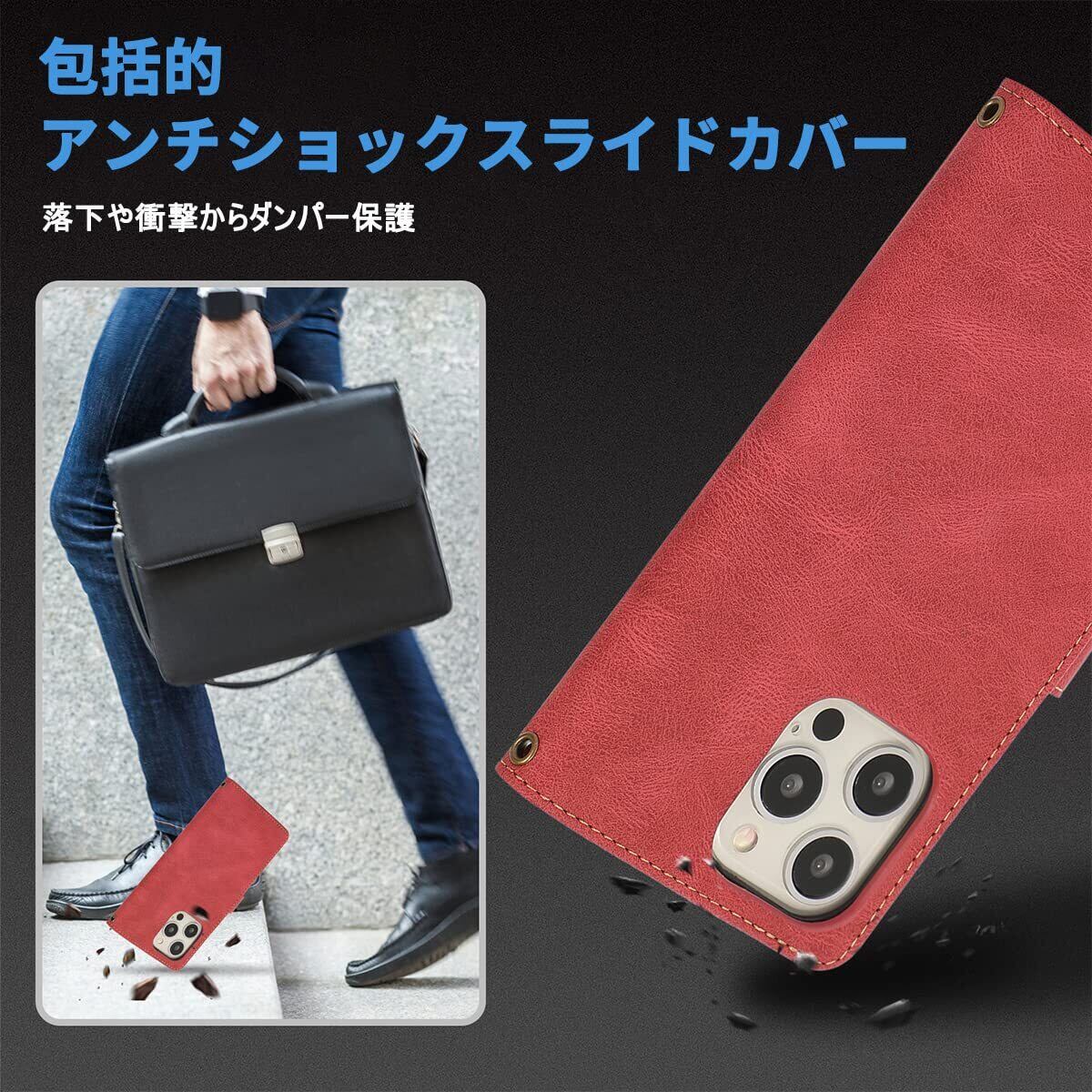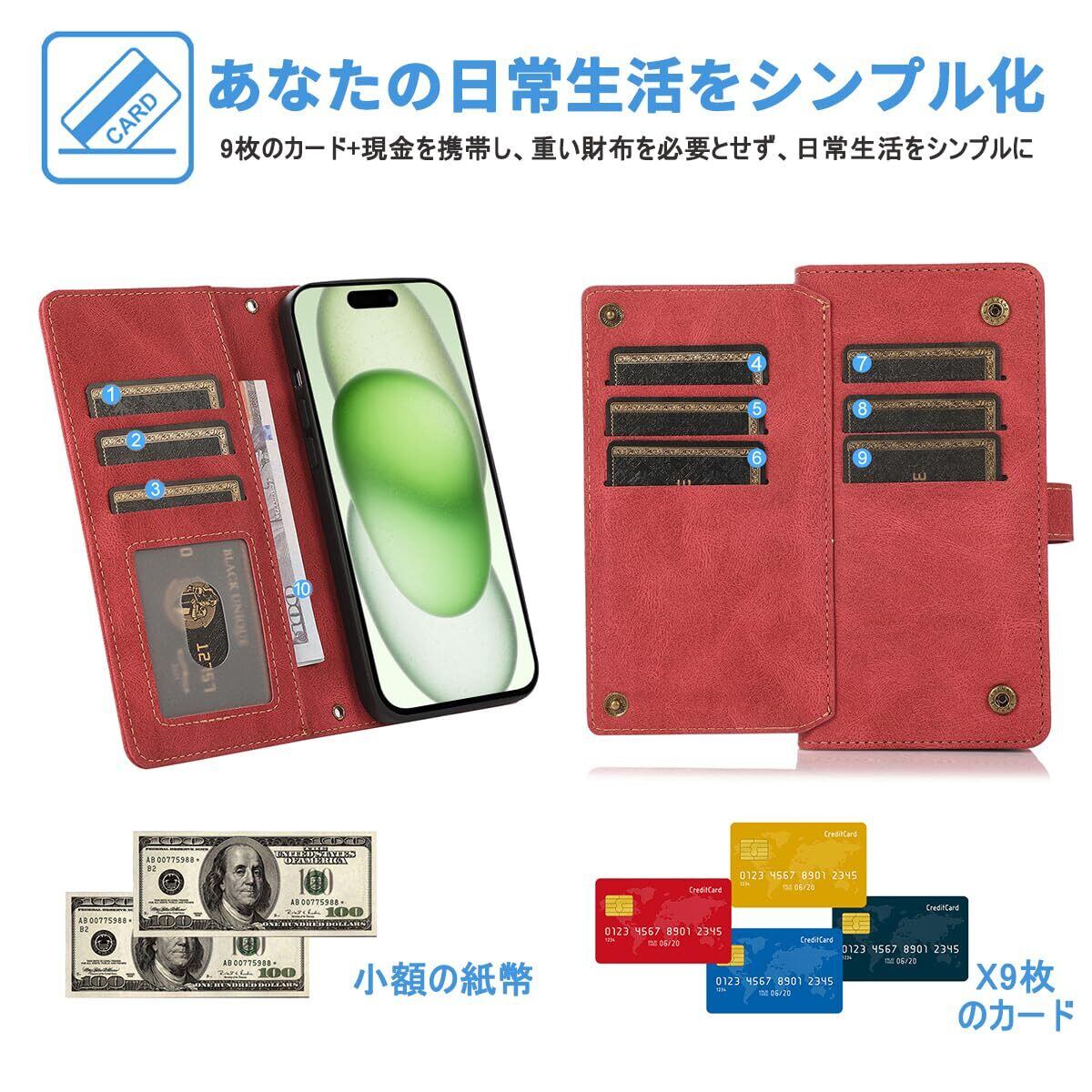 JSCOMYAP iPhone 15 対応 スマホ ケース アイフォン15 肩掛け 首かけ 斜めがけ ショルダー 手帳型ケース iPhone 15 PU皮革携帯カバー 大容量 9枚のカードを収納 横置きスタンド機能 いphone15 iphone15 アイフォン アイホン i phone15 アイホン15 財布型ケース 薄型軽量 耐衝撃 全面保護 レディース メンズ(赤)