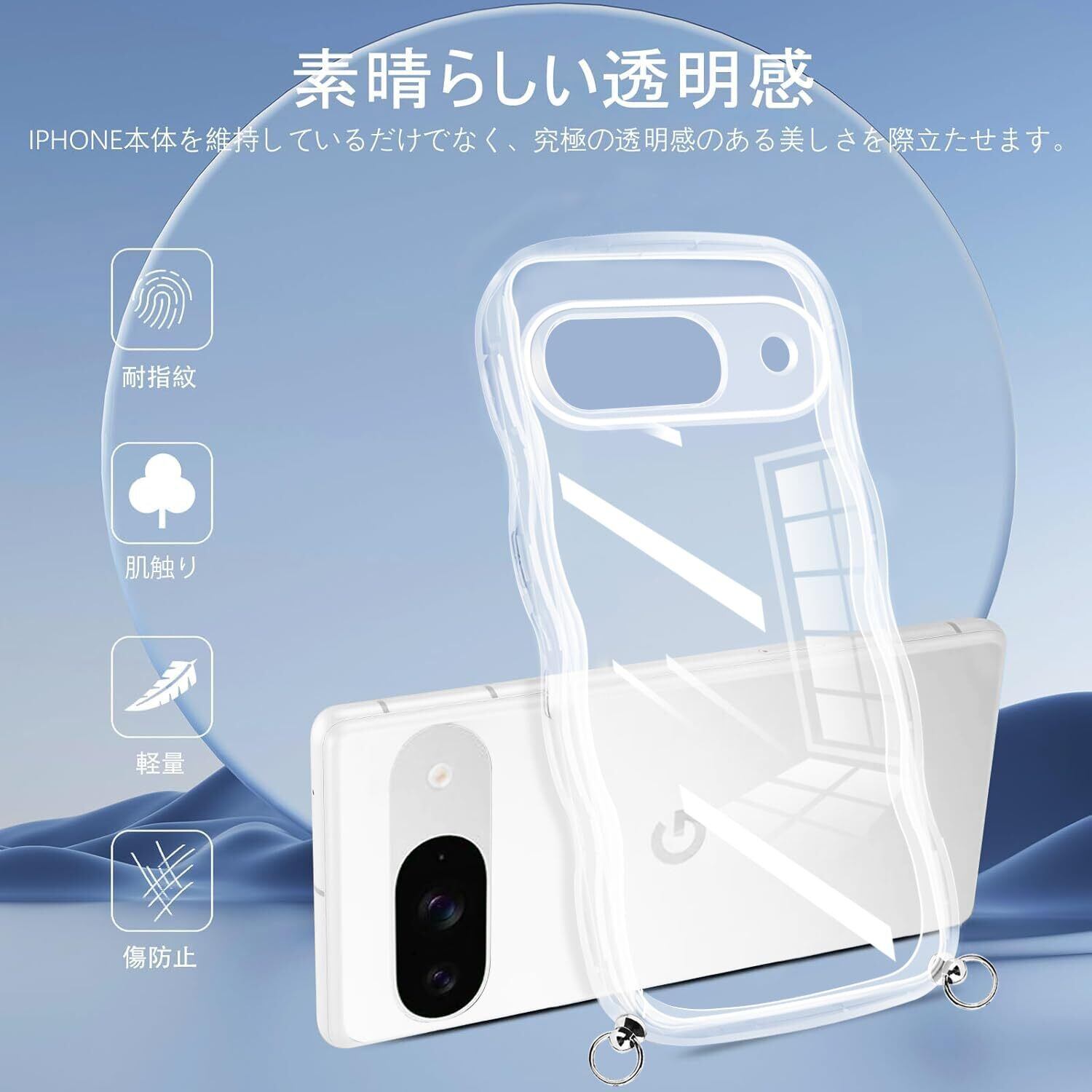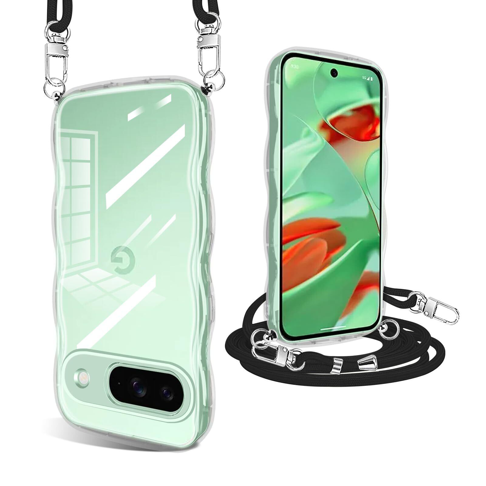 Pixel 9 ケース クリア ショルダー ストラップ付き かわいい 波状フレーム グーグル ピクセル 9 カバー 人気 全面保護 透明 スマホケース 首かけ 肩掛け TPU 薄型 軽量 取り外し可能 長さ調整可能 ワイヤレス充電対応(透明)