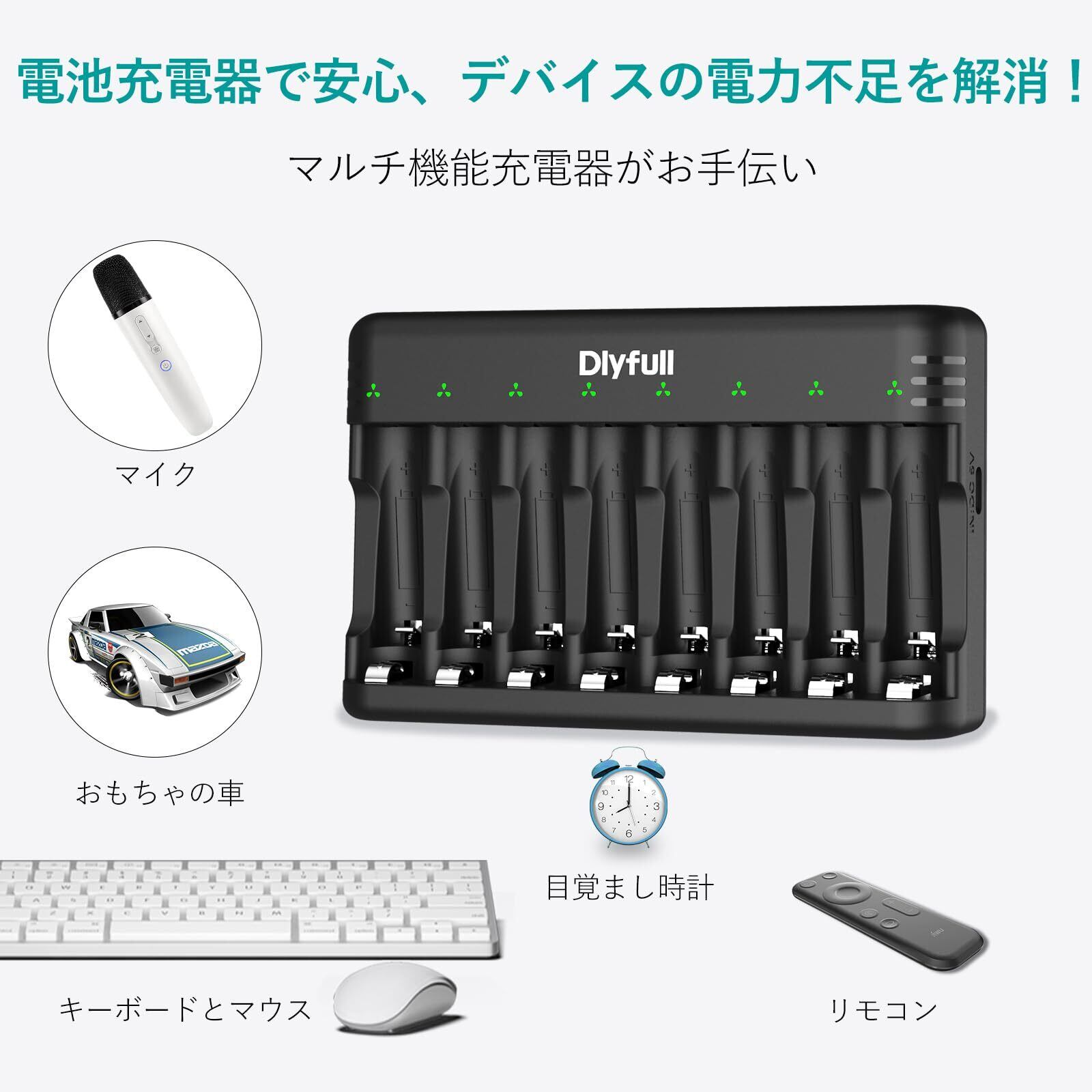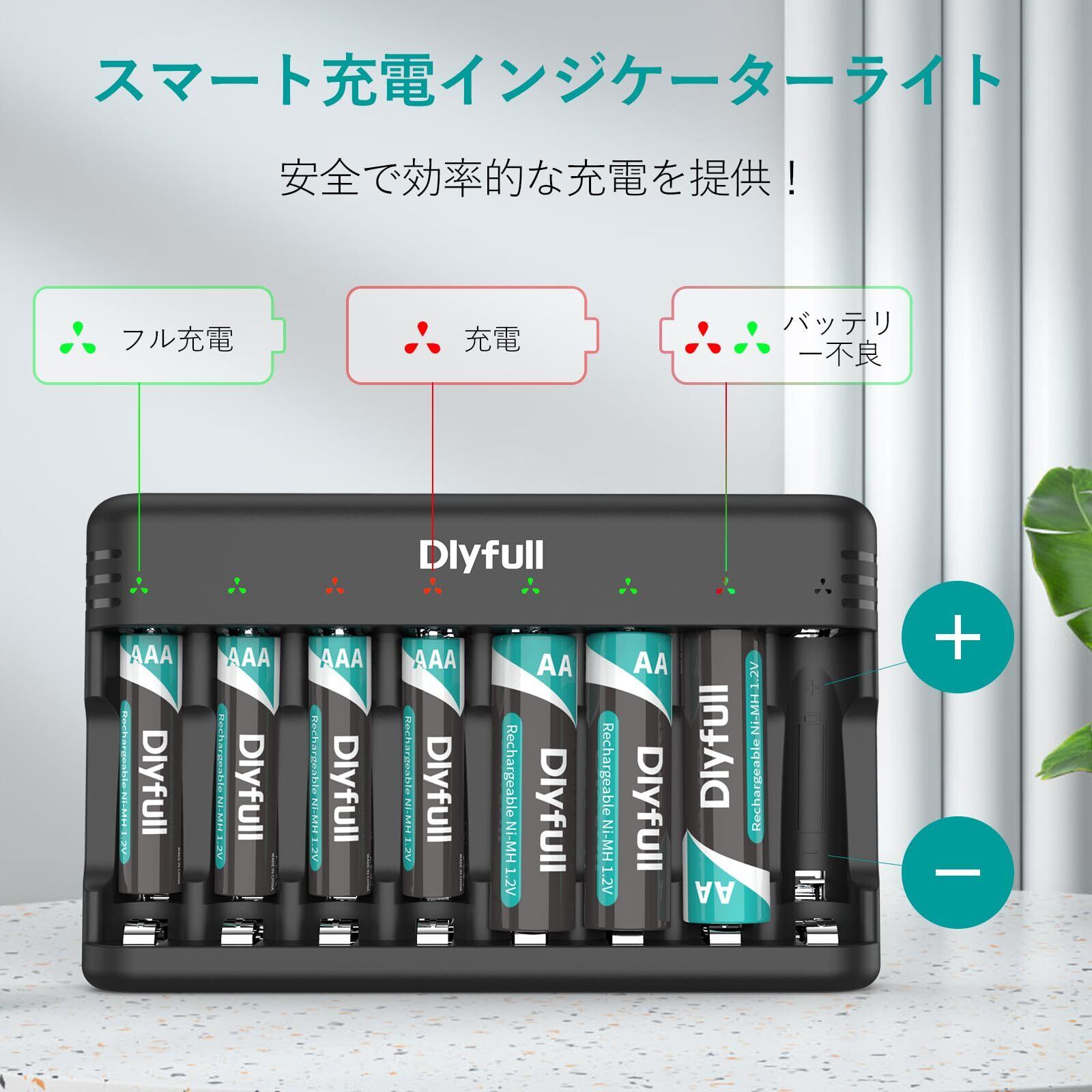 Dlyfull 電池充電器 単4 単3 充電池 充電器、USB Type-C入力 8スロット単三 単4 充電器/充電式ニッケル水素電池 充電器/ニカド充電池に対応 同時充電 LEDライト 単3 バッテリー 充電器 エネループ 充電器 単3 充電池充電器 (黒色)