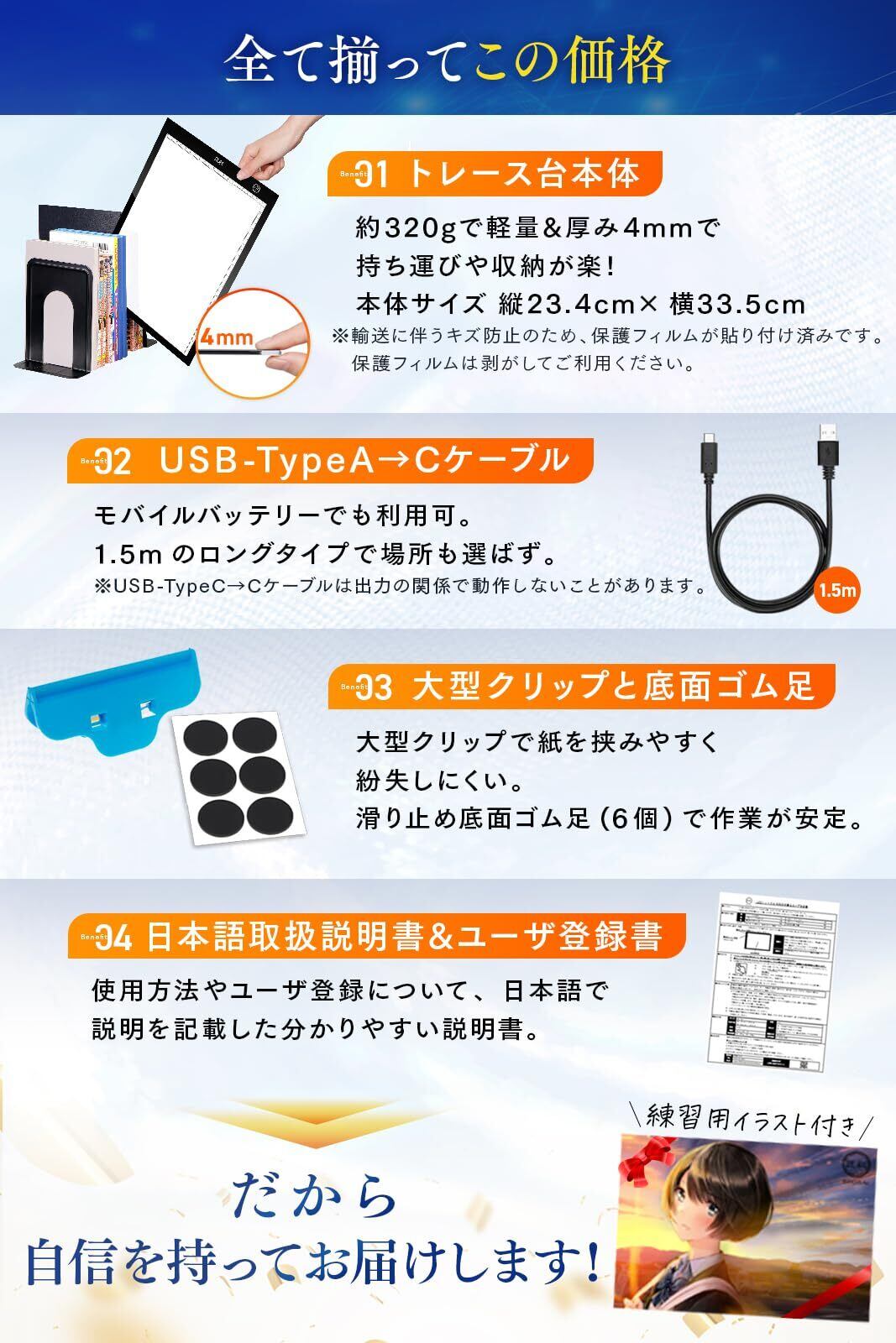 【多様な用途と付属品】1ミリ刻みの 目盛り 付で イラスト の正確な 模写 や線引き 漫画 のコマ割りに便利。 ダイヤモンドアート ライト にも使用できます。付属の1.5M USBケーブル と大型 クリップ で場所を選ばず トレス できます■本体は 厚さ 4mm の小型軽量でどこへでも持ち運び可能。学生や子供へのプレゼントにも可