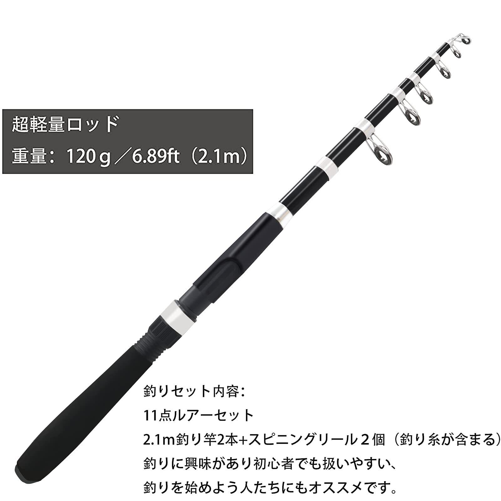 2.1m釣り竿2本+スピニングリール2個(釣り糸が含まる)+11点ルアーセット+専用ケース1個 本セットは、釣りに必要な道具を全部含み、他の付属品を購入する必要なく、このままで利用頂けます。