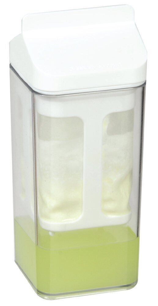 市販のヨーグルトを1パック(450g)まるまる入れて待つだけ。水分が切れて濃密でヘルシーなギリシャヨーグルトに