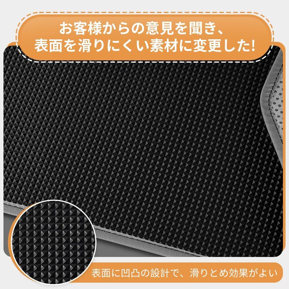 【両面滑り止め仕様のシート】表面は凹凸ピラミッド柄の設計で、一定以上の荷重がかかるとズレにくくなります。裏面にゴム粒付きの加工を施しており、従来のメッシュマットと比較して大変滑りにくい仕様です。安心であんぜんなカーマットです。車内では釣り具やレジャー用品の運搬に大活躍です。