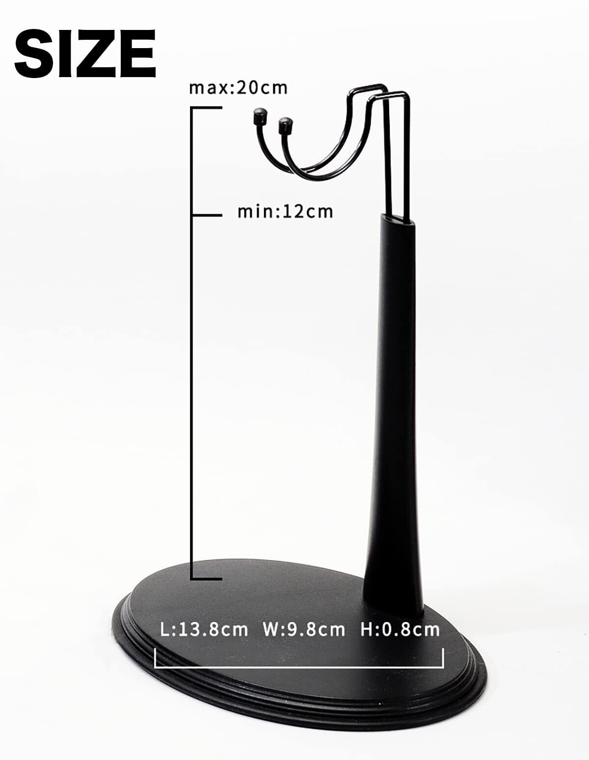 【ネームプレート無し仕様】軽量で丈夫な1/6スケール用ディスプレイスタンドです。 簡単組立でしっかり固定!大切なフィギュアの転倒防止、ディスプレイにGood! 【サイズ】高さ:12〜20cmで調節可能 台座幅:13.8cm 奥行き9.8cm 台座の高さ:0.8cm 【商品内容】5個セット 【カラー】ブラック 【重量】1個あたり約60グラム