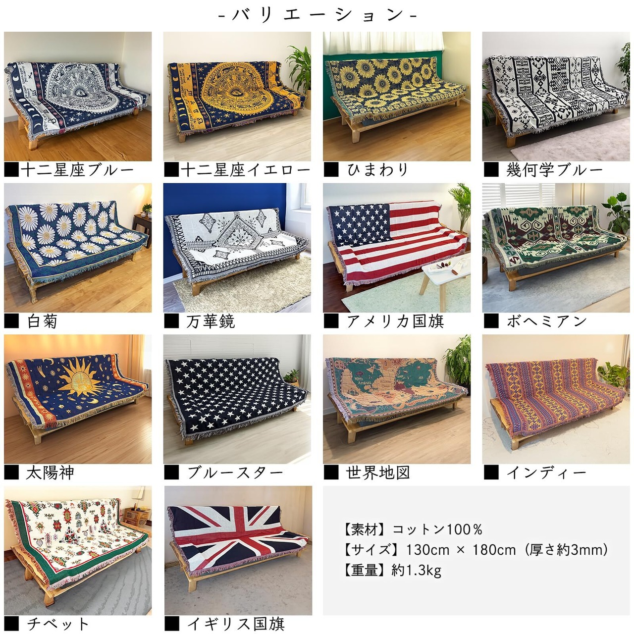 北欧デザインのマルチカバーは、太陽柄、星条旗、星座模様など多彩なバリエーションを揃えています。お部屋の雰囲気を変えるアイテムとして最適で、シンプルなインテリアにも馴染みます。サイズは130×180cmで、ソファーカバーやベッドカバー、こたつ掛けカバーなど幅広い用途に対応します。