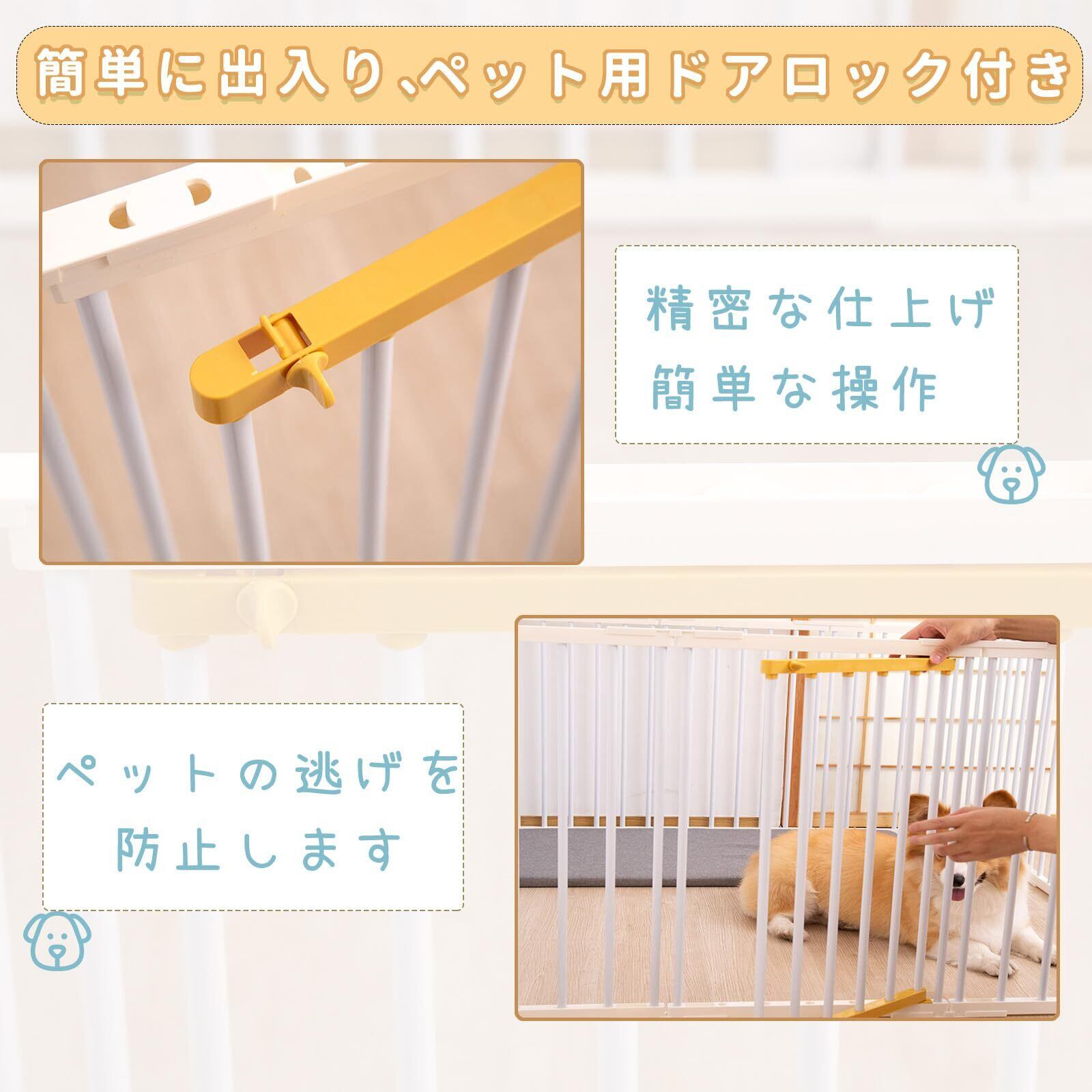 ユニークなデザイン:スペースに合わせてパネルを活かして、長方型、正方型、L字型などに変更できます。ペットに窮屈な思いをさせる事なく、日常のトイレ訓練やハウストレーニングに便利なペットサークルです。