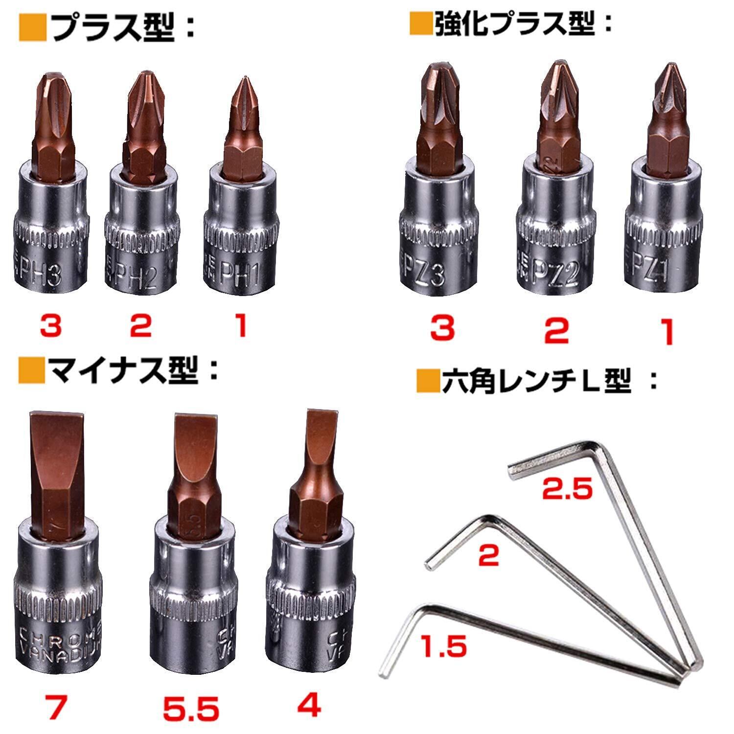 【セット内容】ラチェットレンチ6.3mm(1/4)、ドライバーハンドル1/4、ユニバーサルジョイント、交換用ビットアダプター、エクステンションバー4pc、六角レンチL型3pc、ソケット13pc、S2合金鋼ビット21pc、ハードケース入り。詳しいセット内容が商品情報にご参考ください。