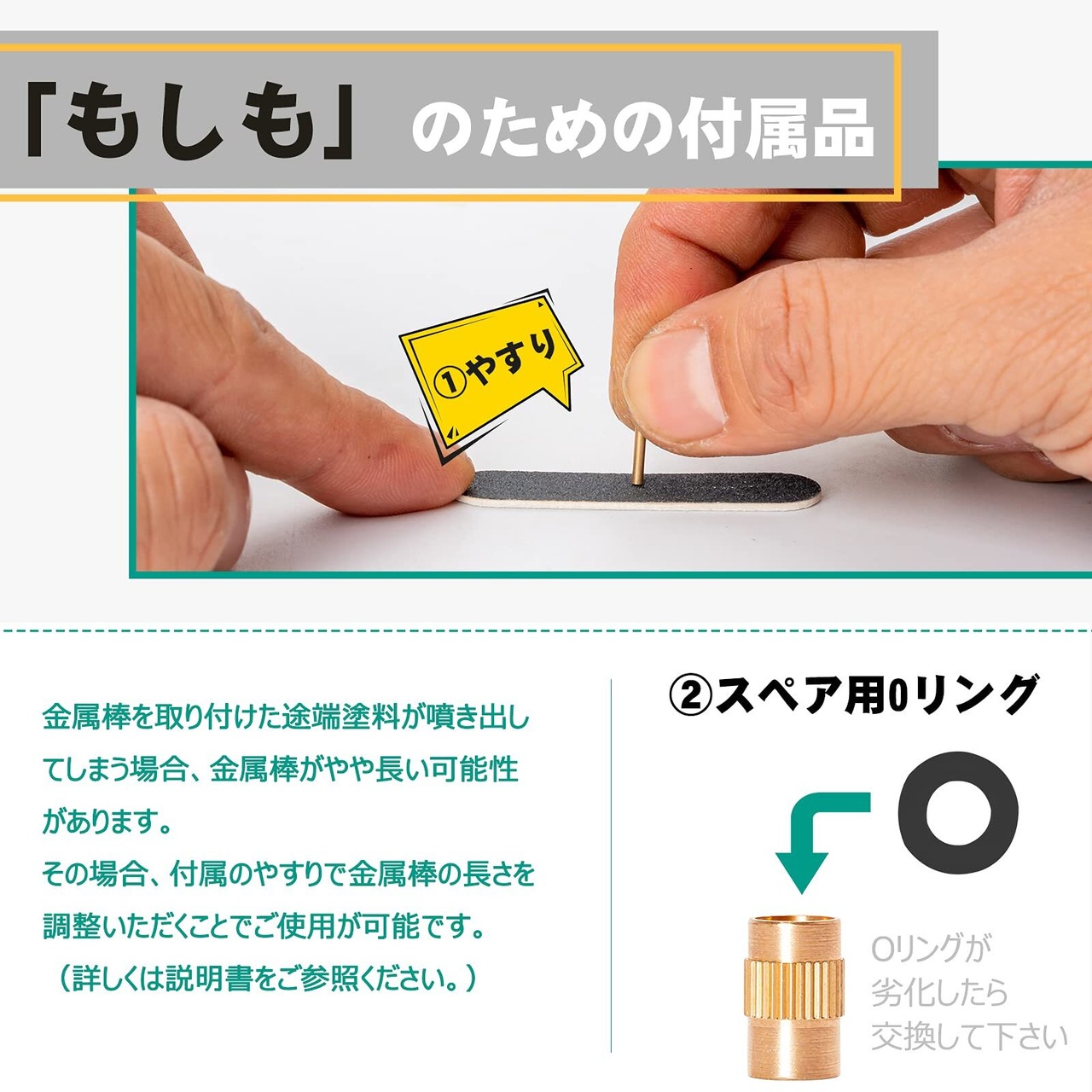 【「もしも」の時に】ジョイントを取り付けた途端エアーが勝手に出てきてしまう場合、金属棒がやや長い可能性があります。その場合は、付属のやすりで金属棒を短く整えて下さい。ミニ金属棒は磨きやすい銅製なので、女性でも取扱いが簡単です(詳しい調整方法は付属の説明書をご参照ください)。また、ジョイント内部のOリングは、劣化に備え備品も付属していますので、適宜お取替えいただけます。