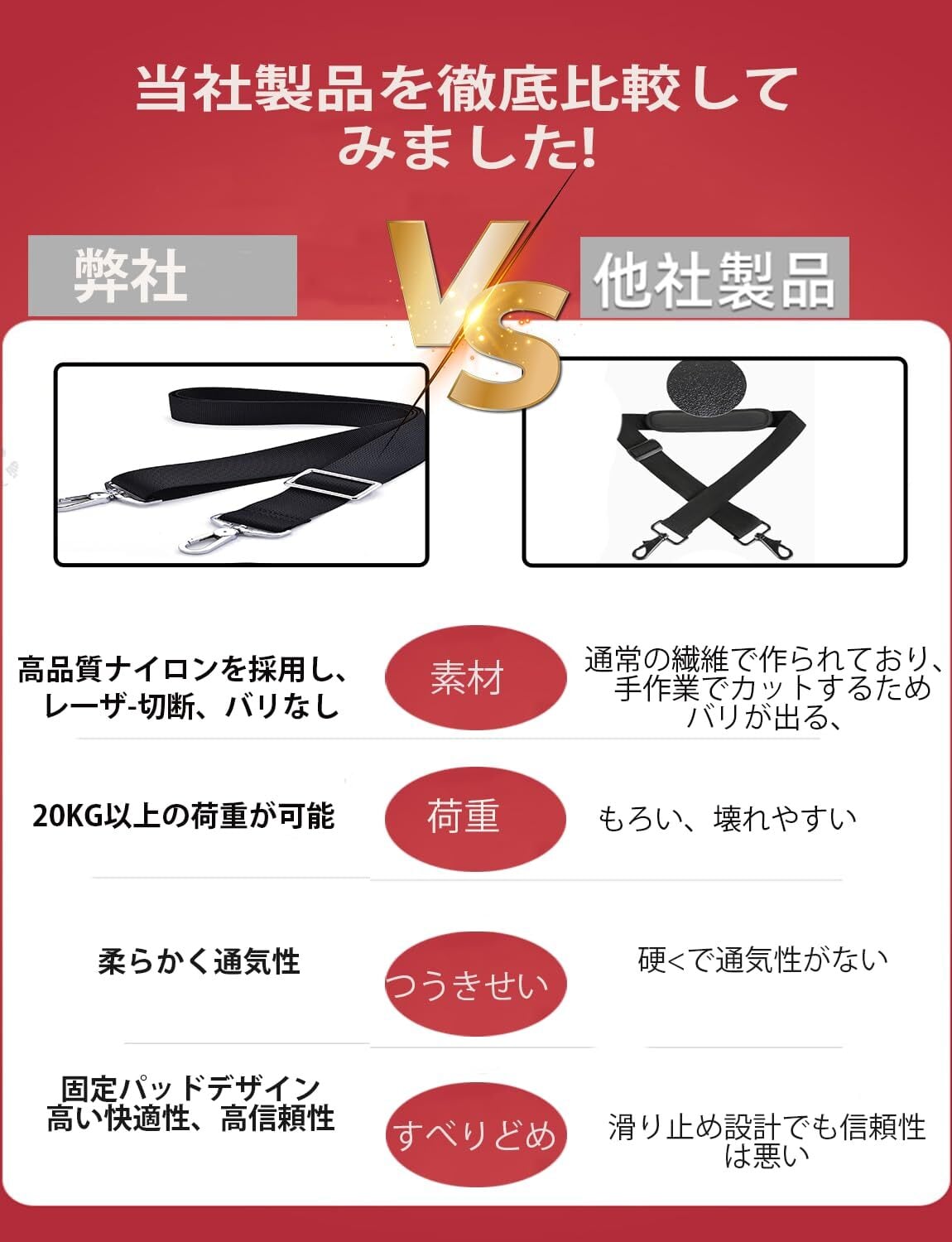 【強くて耐久性のある】この製品は金属製のフックを使用しており、丈夫で耐久性があり、損傷しにくいです。ショルダーストラップは強力なナイロン生地で作られており、多くの重量に効果的に耐えることができ、ショルダーストラップの縫い目には高強度のバックルが使用されているため、製品が傷つきません。変形しやすく、ショルダーバッグの落下を防ぎます。長くて厚みのあるショルダーパッドは歩くときに常に肩に密着するので、パッドのズレに影響されずに歩くことができ、重い荷物を持っていても肩が痛くなりにくいです。