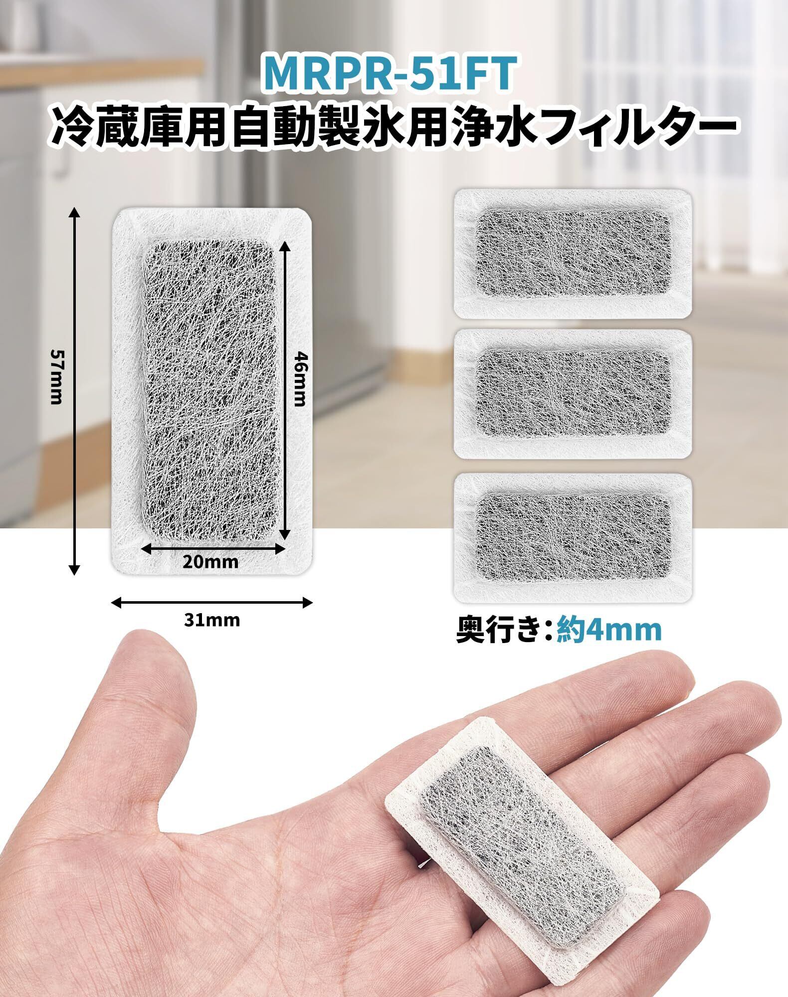 【対応形名】MRPR-51FT三菱電機(ミツビシ·MITSUBISHI ELECTRIC) 冷蔵庫用の製氷機フィルターです。(給水タンク内にセットする浄水フィルターで、 M20KY6526、M20CM4526の互換品)。材質:ポリエステル・活性炭、サイズ:長57mm×幅31mm×奥行き5mm、 機能:水道水をろ過して水中に含まれる不純物を除去し、できた氷はカルキ臭さを低減します。